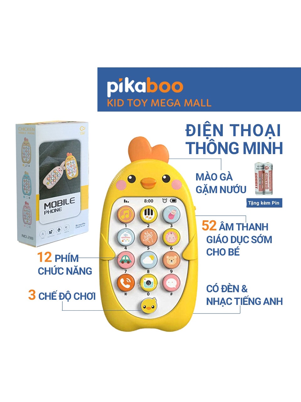 Combo điện thoại đồ chơi cho bé gà vàng kèm pin đáng yêu có đèn và nhạc Pikaboo, chất liệu cao cấp