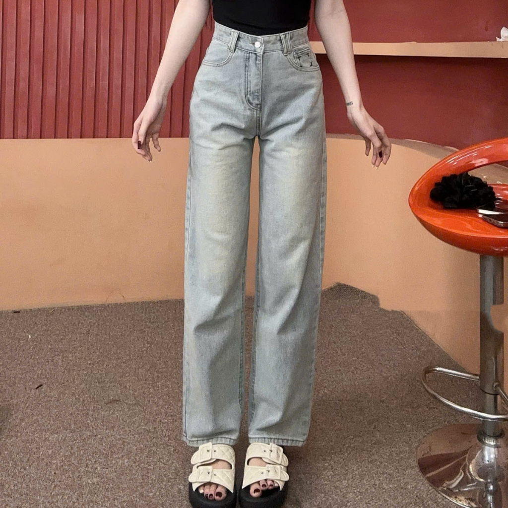 Quần Jean Nữ Ống Suông Có Fom Ngắn 95Cm Lưng Cạp Cao Túi Thêu Đơn Giản Vải Cotton Mềm Mát Không Co Giãn Q421