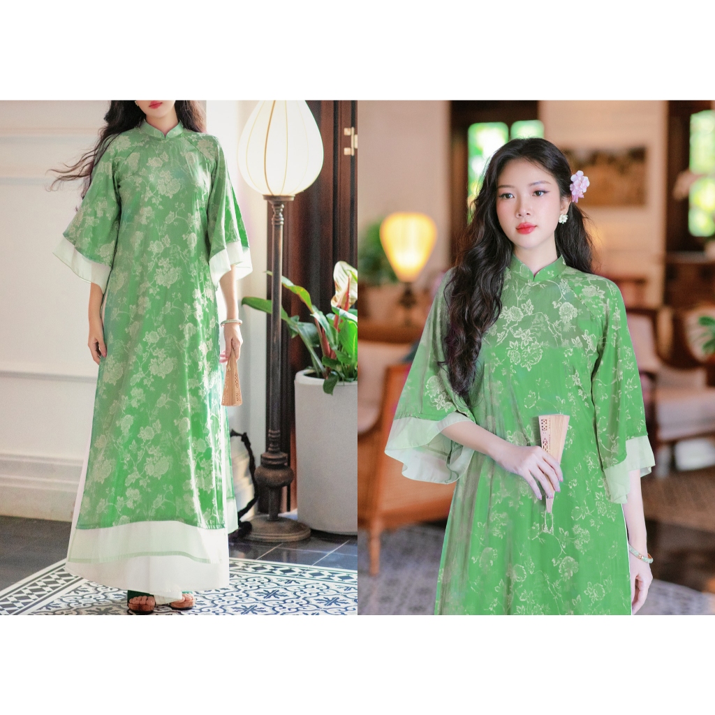 Áo Dài Cách Tân Nữ Gấm Lụa Dệt Hoa Nhí Dáng Suông Kiểu Hiện Đại Tay Lỡ, Áo Dài Truyền Thống Bigsize Nữ Màu Xanh Hồng