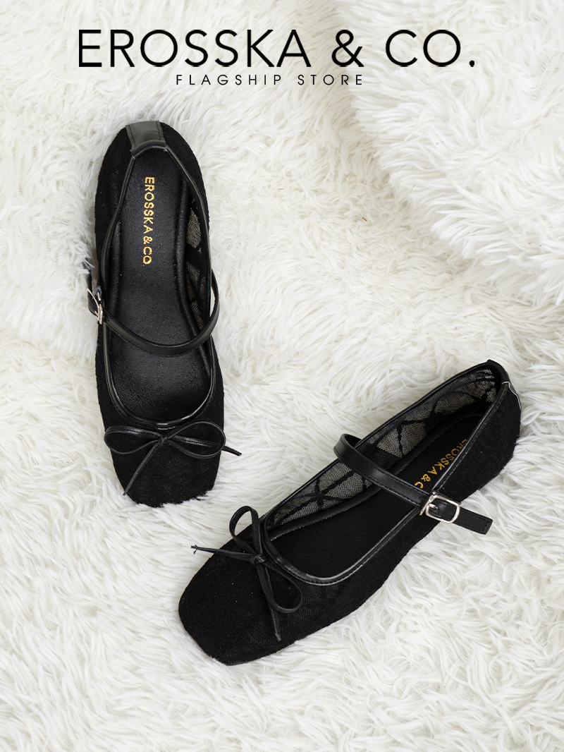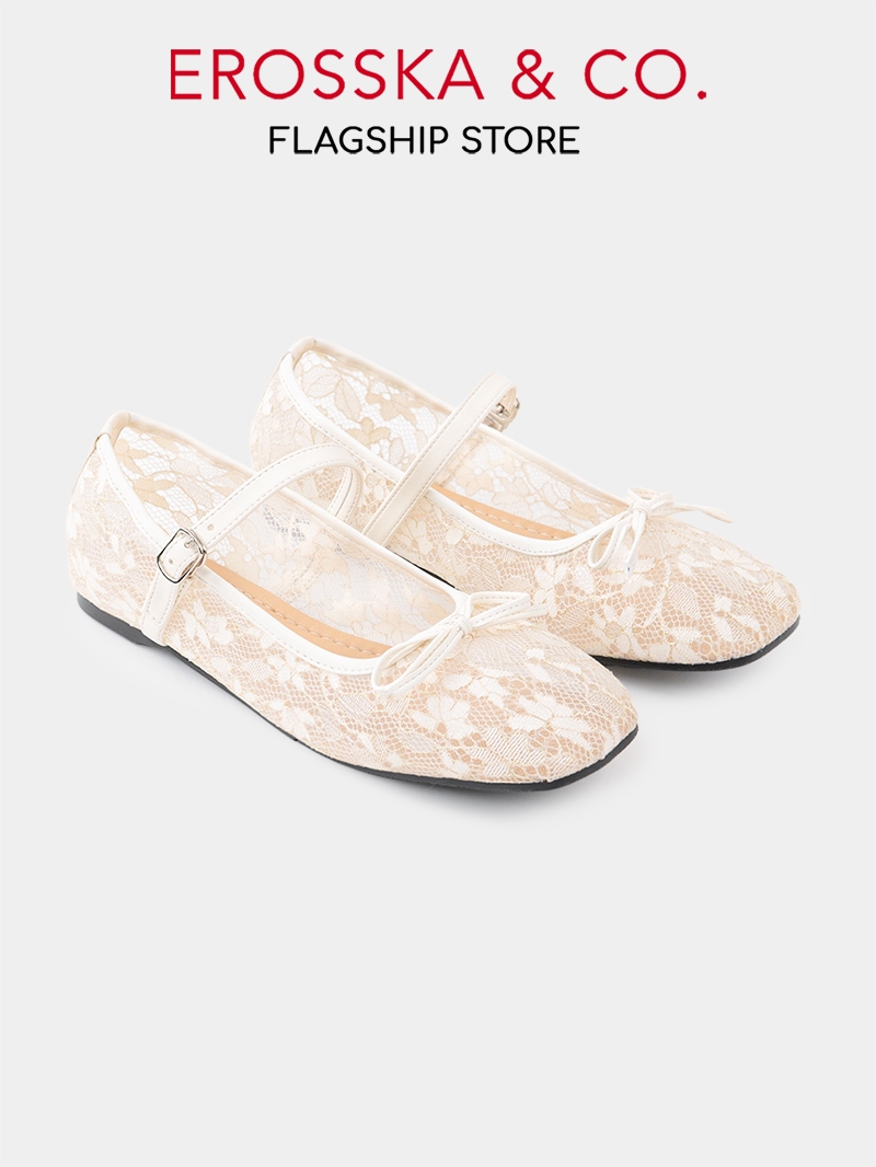 EROSSKA [FORM TO LÙI 1 SIZE] - Giày búp bê nữ balletcore lưới quai ngang phối nơ màu trắng kem-EL085