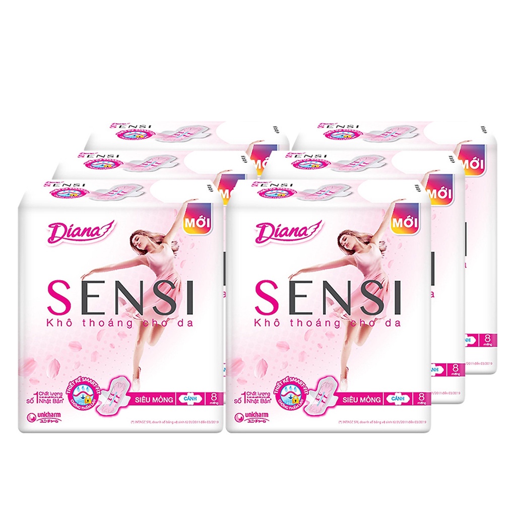 Lốc 6 gói Băng vệ sinh Diana Sensi trắng 8 miếng, 6 gói Băng Vệ Sinh Diana SENSI cánh (8 Miếng/gói)
