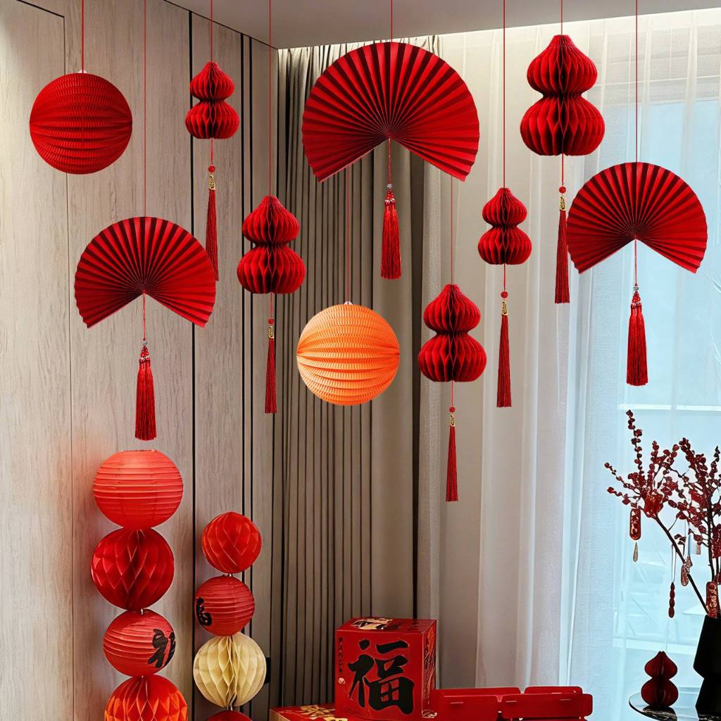 [Tết 2026] Set trang trí quạt giấy đỏ-Set quạt giấy kèm phụ kiện treo trần decor tiệc cưới,tết.đón xuân