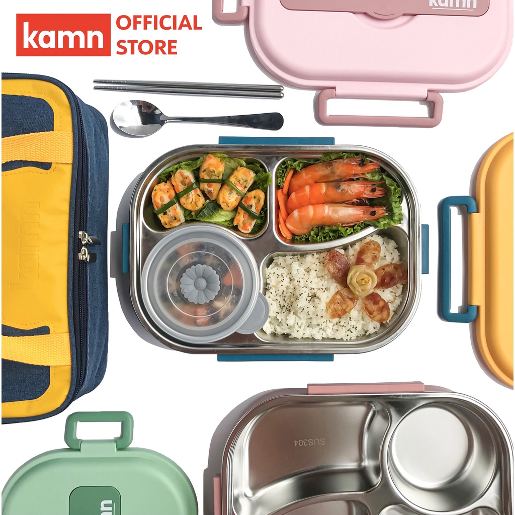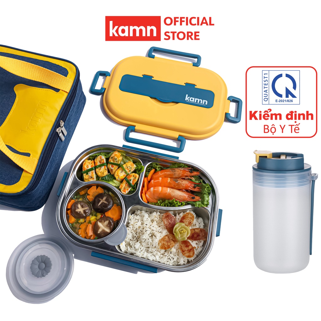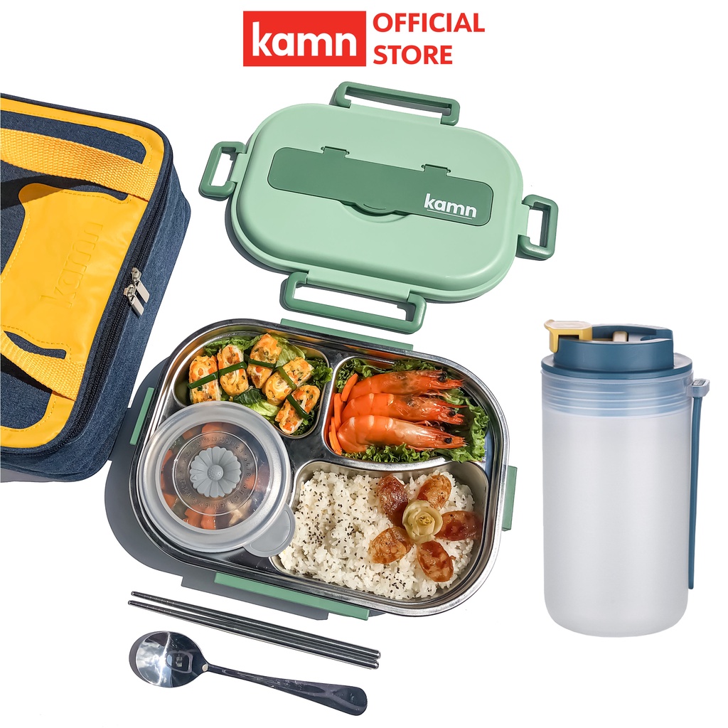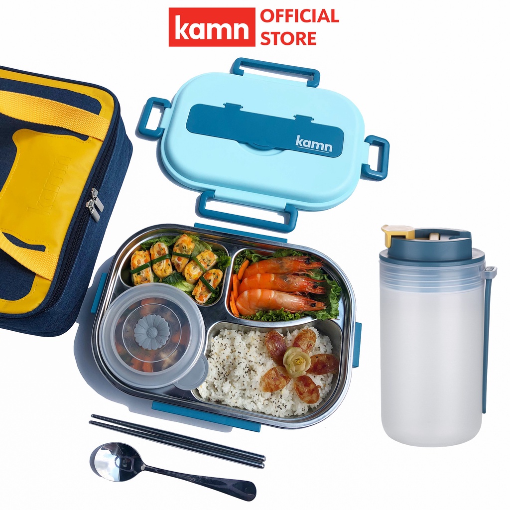 Combo hộp cơm văn phòng 1500ml kèm bình nước đa năng 350ml Yummy Kamn inox 304, 4 ngăn chống tràn