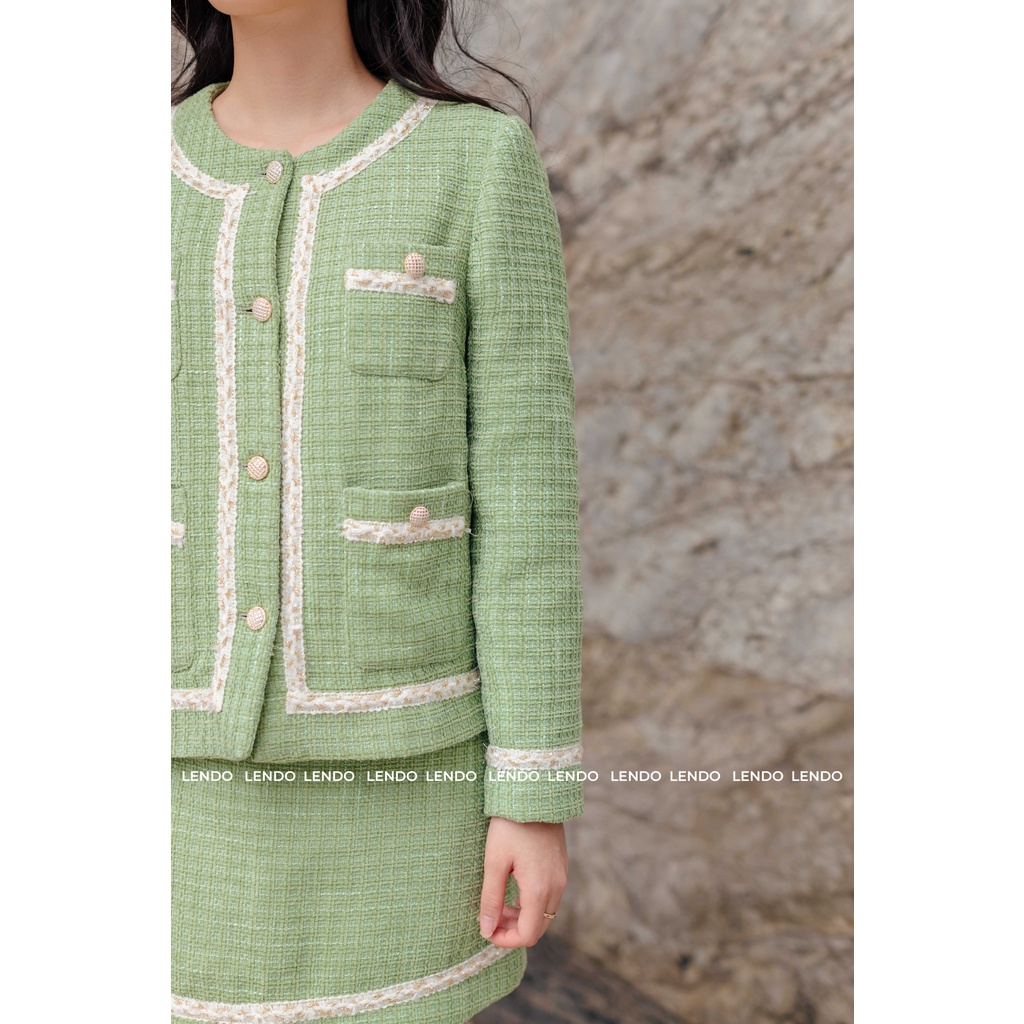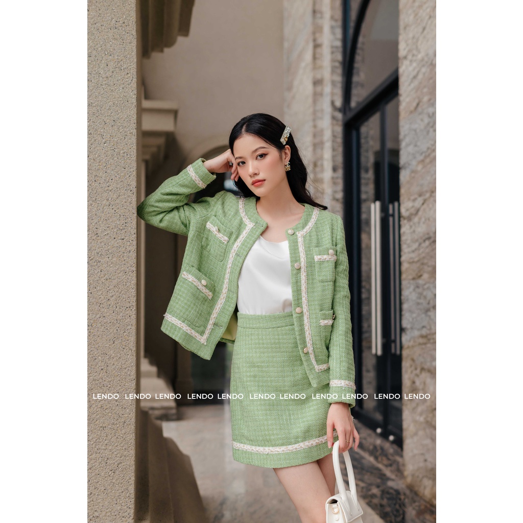 Sét Bộ Dạ Công Sở LENDO SB220814 Áo Cổ Tròn Phối Viền Trắng Dài Tay Chân Váy Mini Dáng A