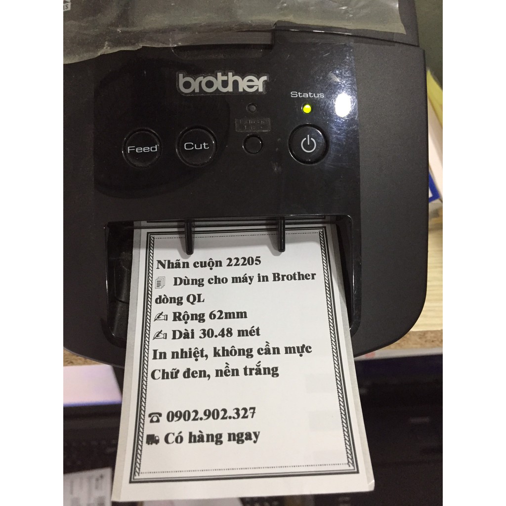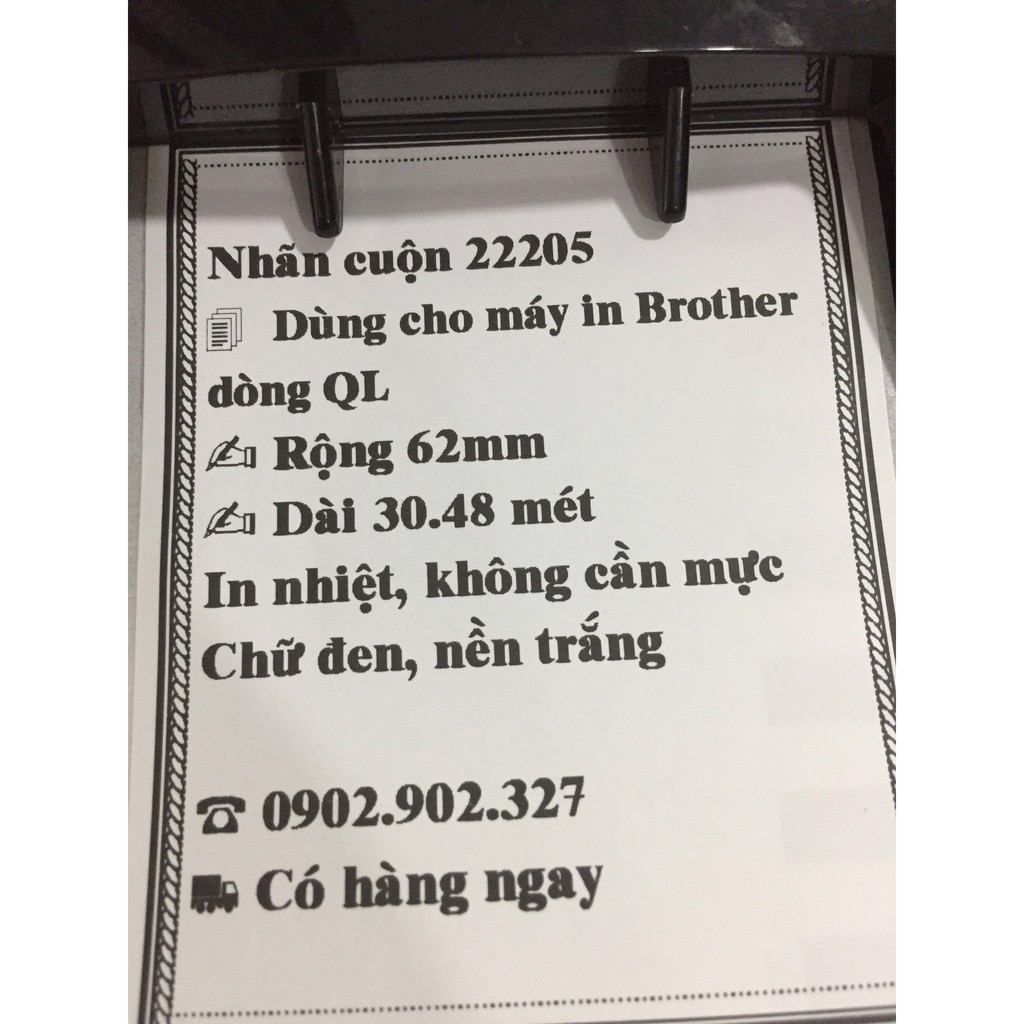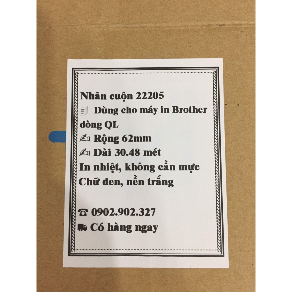 Giấy in nhãn Brother DK-22205, Rộng 62mm, Dài 30.48m, chữ đen nền trắng. Dùng cho máy in nhãn Brother dòng QL