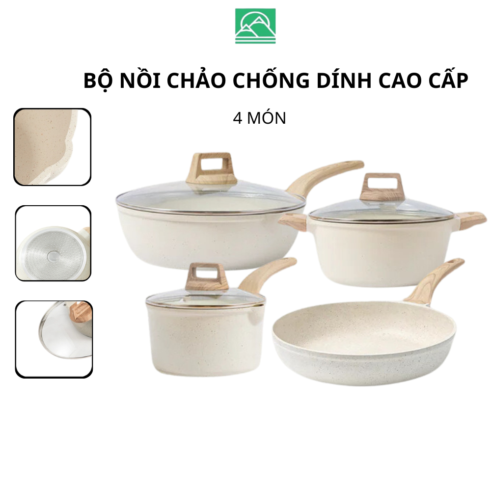 Bộ nồi vân đá chống dính cao cấp 4 món Mitomo, đúc nguyên khối,dùng trên mọi loại bếp - Hàng chính hãng