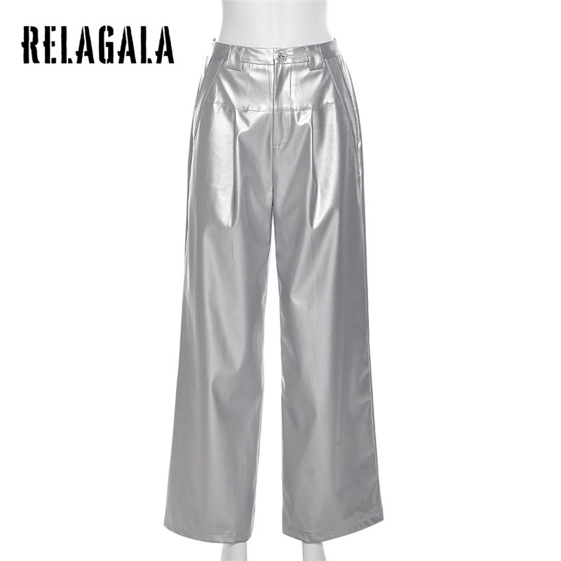 RelaGala Nữ Mới Màu Trơn Rời Thời Trang Đường Phố Cao Cấp Thường Ngày Thẳng Quần Ống Rộng
