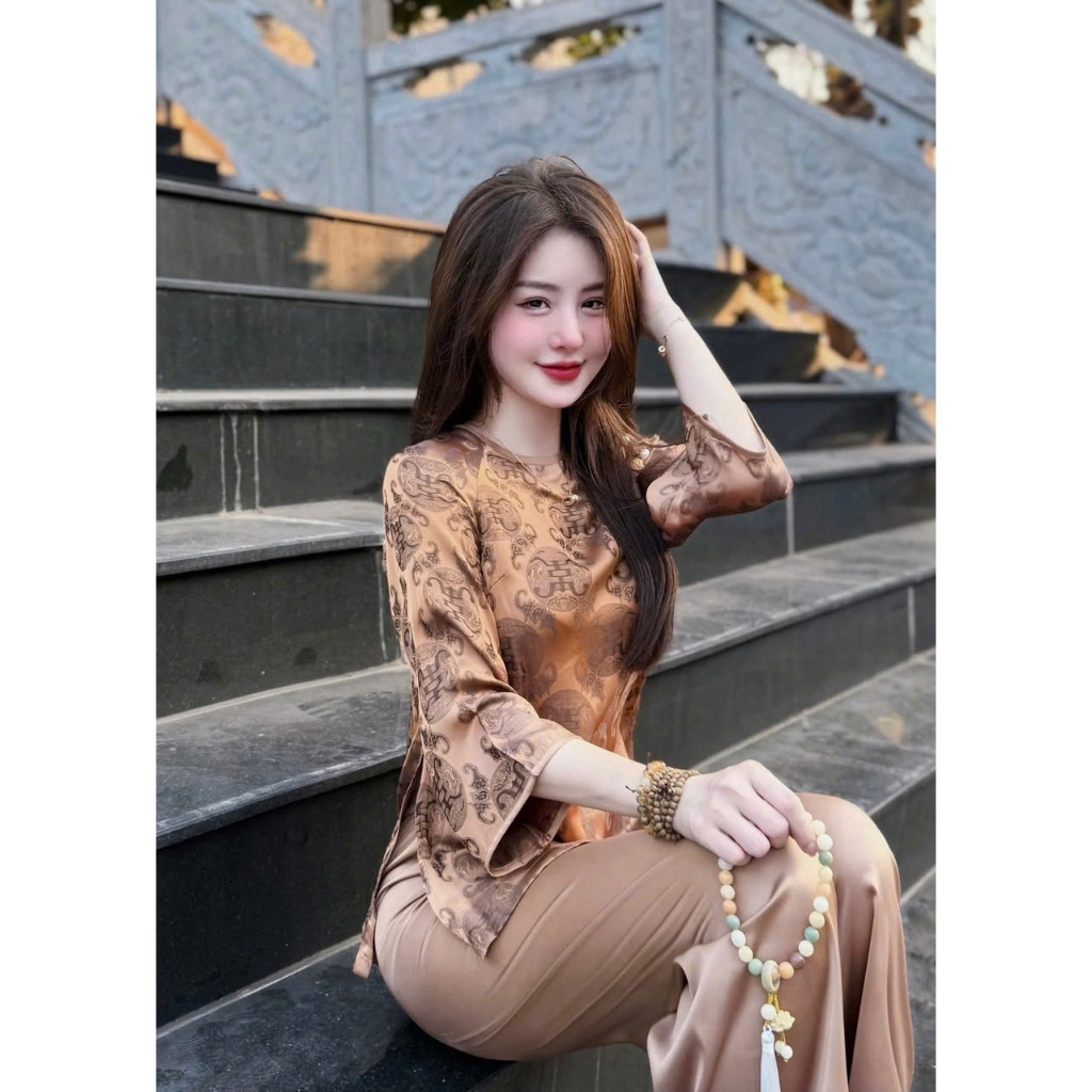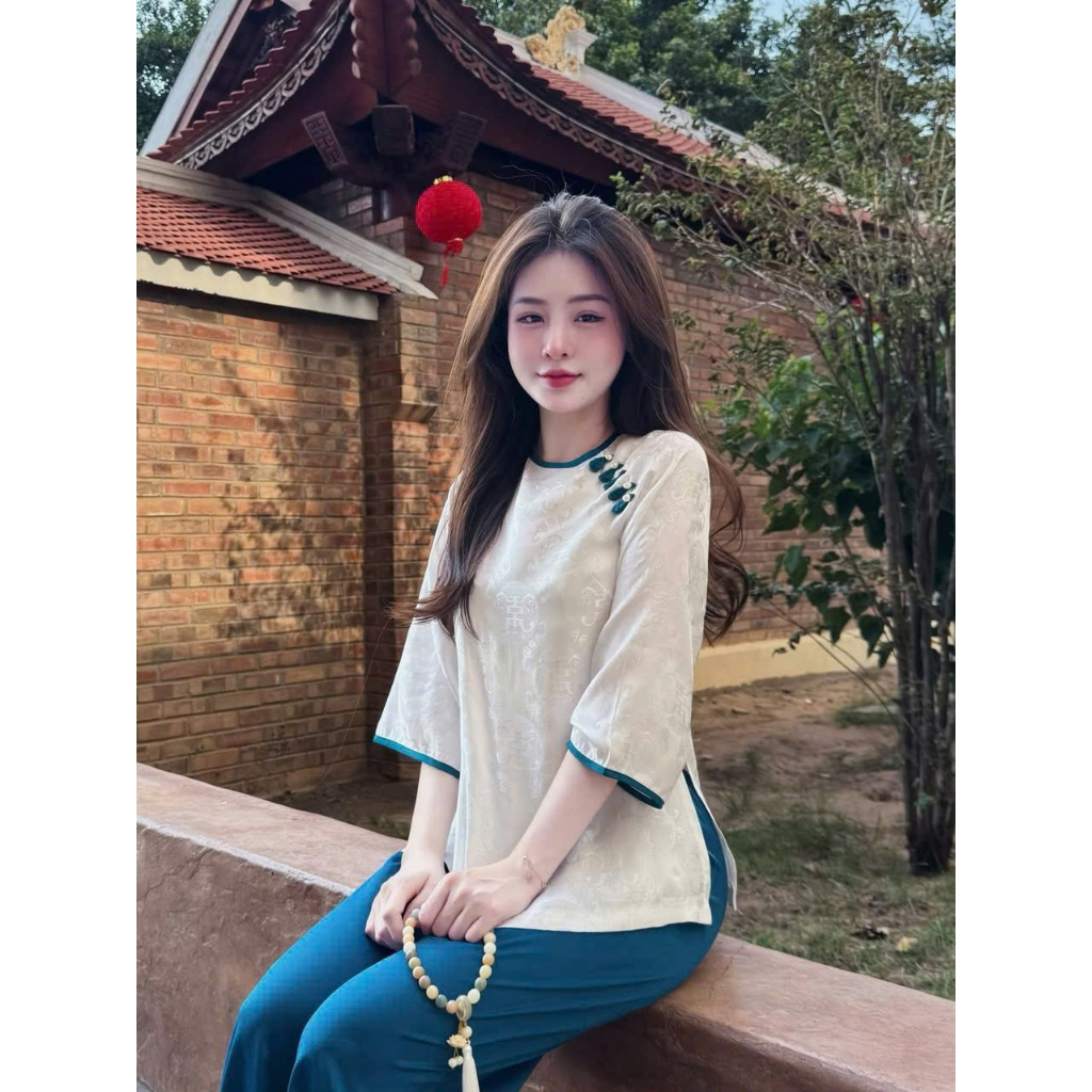Set áo lam gấm hoa kết hợp nút tàu và quần tuyết nhung ống rộng, thanh lịch và duyên dáng.