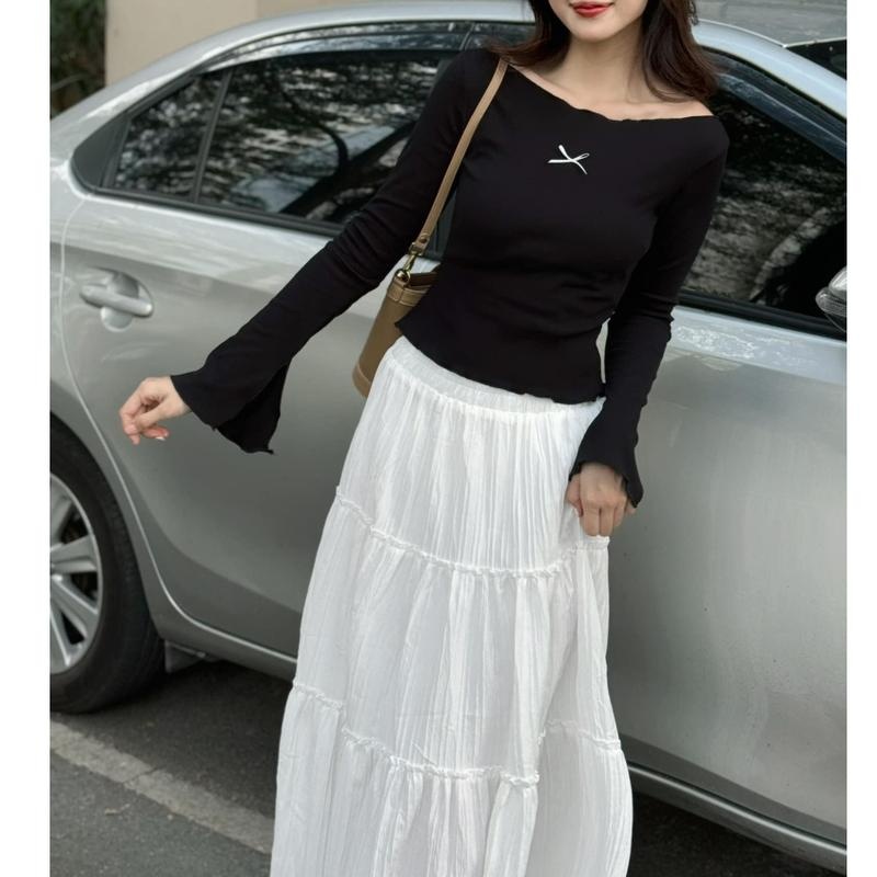 SAM - ( Có tách set) Set váy áo trễ vai tay dài phối nơ và chân váy đũi dáng dài phong cách điệu đà tiểu thư- A278