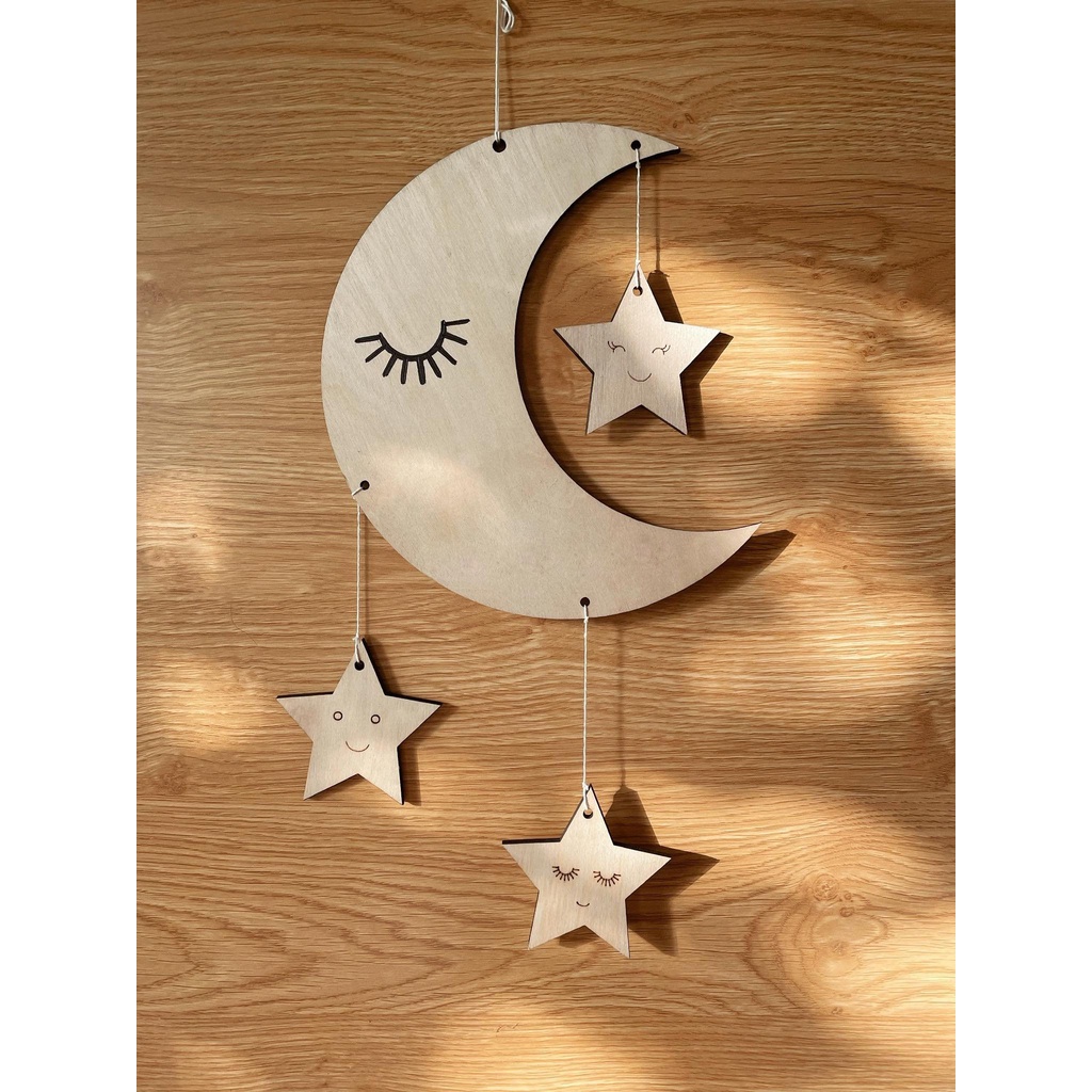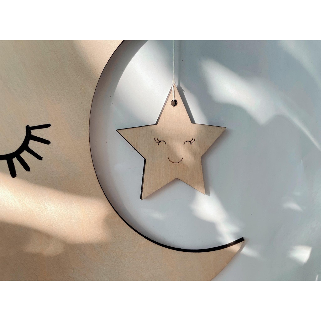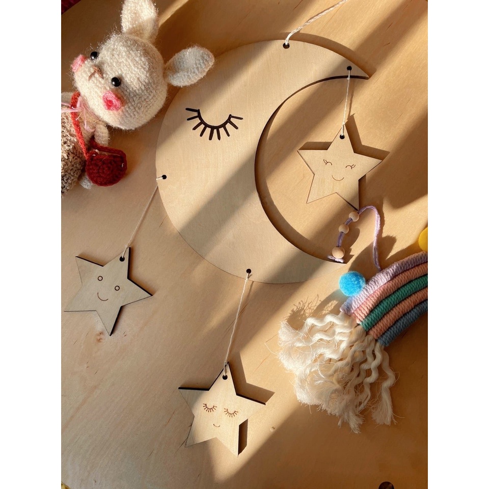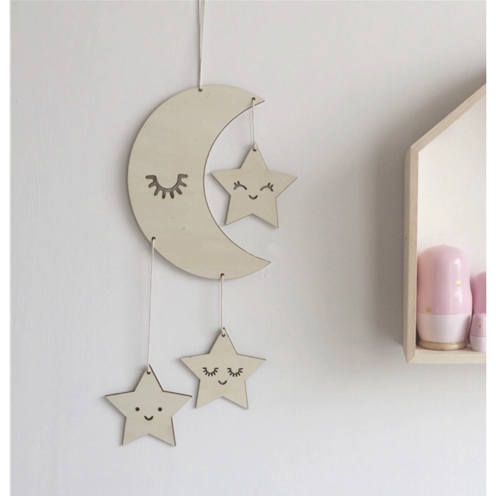 Set Trăng Sao Ngủ Bằng Gỗ Trang Trí Phòng Bé, Nhà Cửa, Treo Nôi Bé , Set Trăng Sao Treo Tường