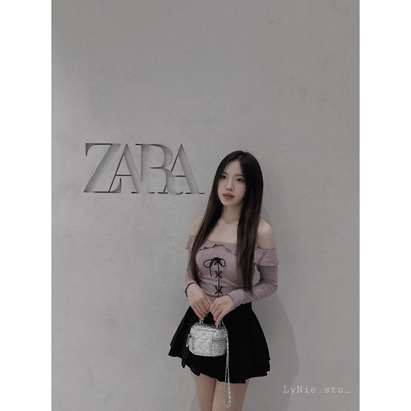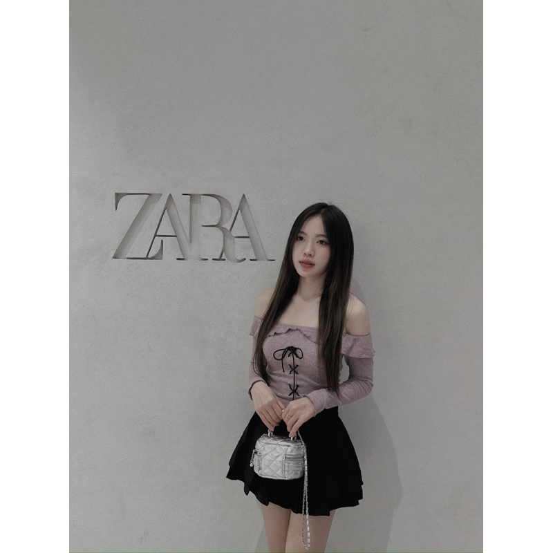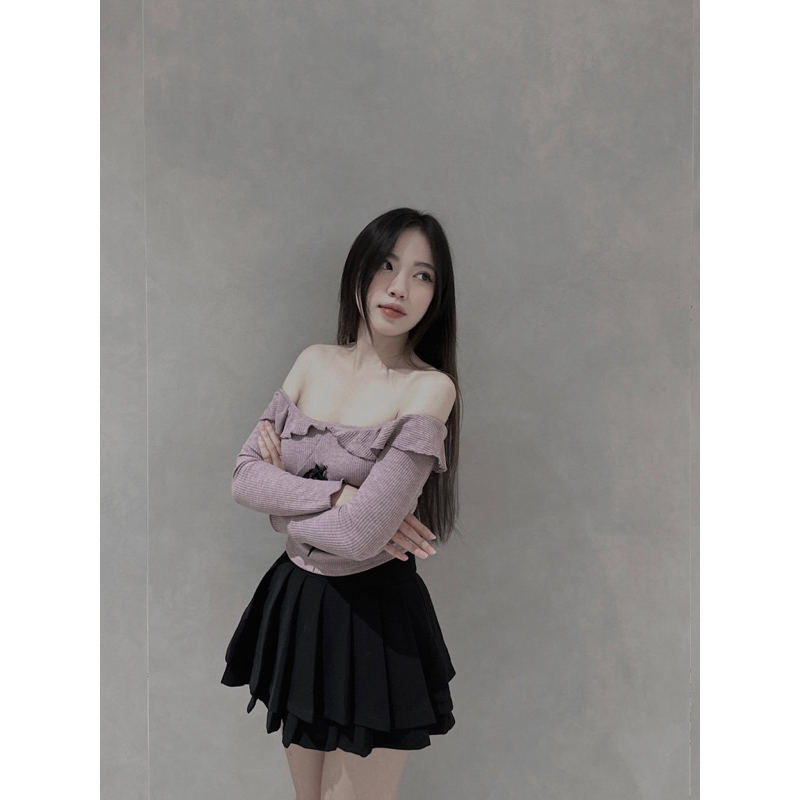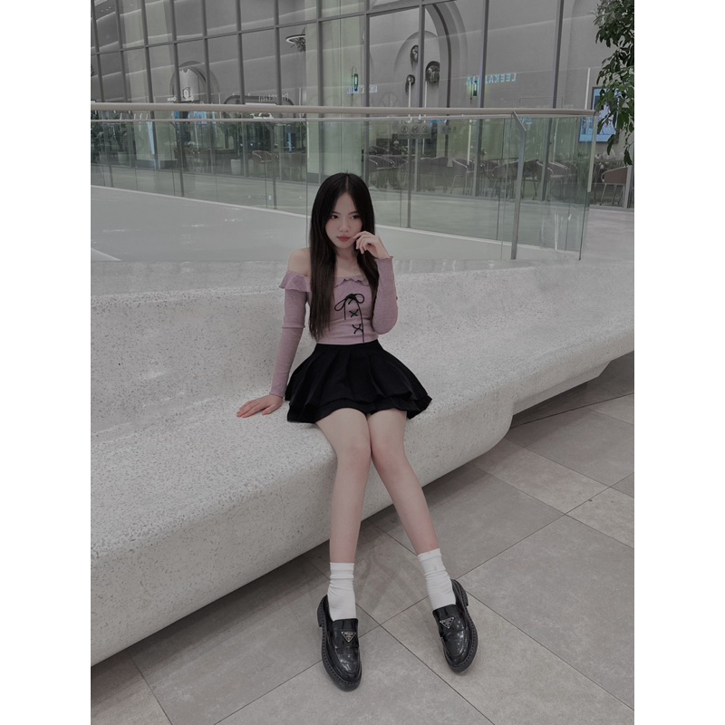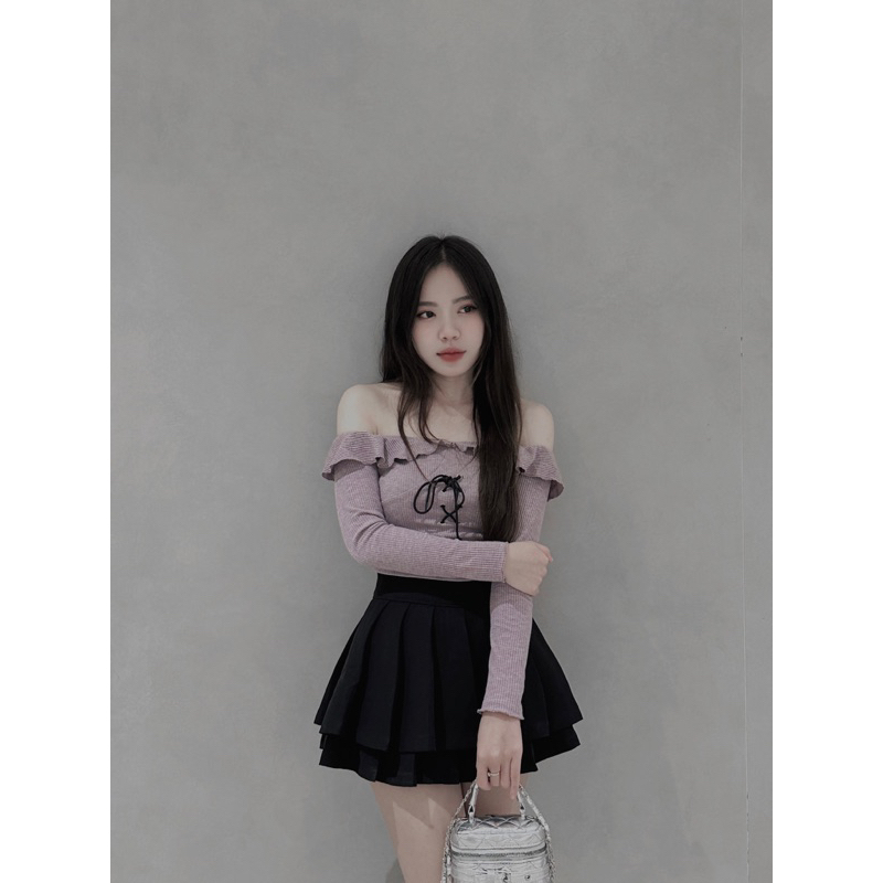 Set đồ Mai Phương Bùi, chân váy xếp li 2 lớp có quần bảo hộ kèm theo áo trễ vai có nơ ( Hình shop tự chụp độc quyền nha)