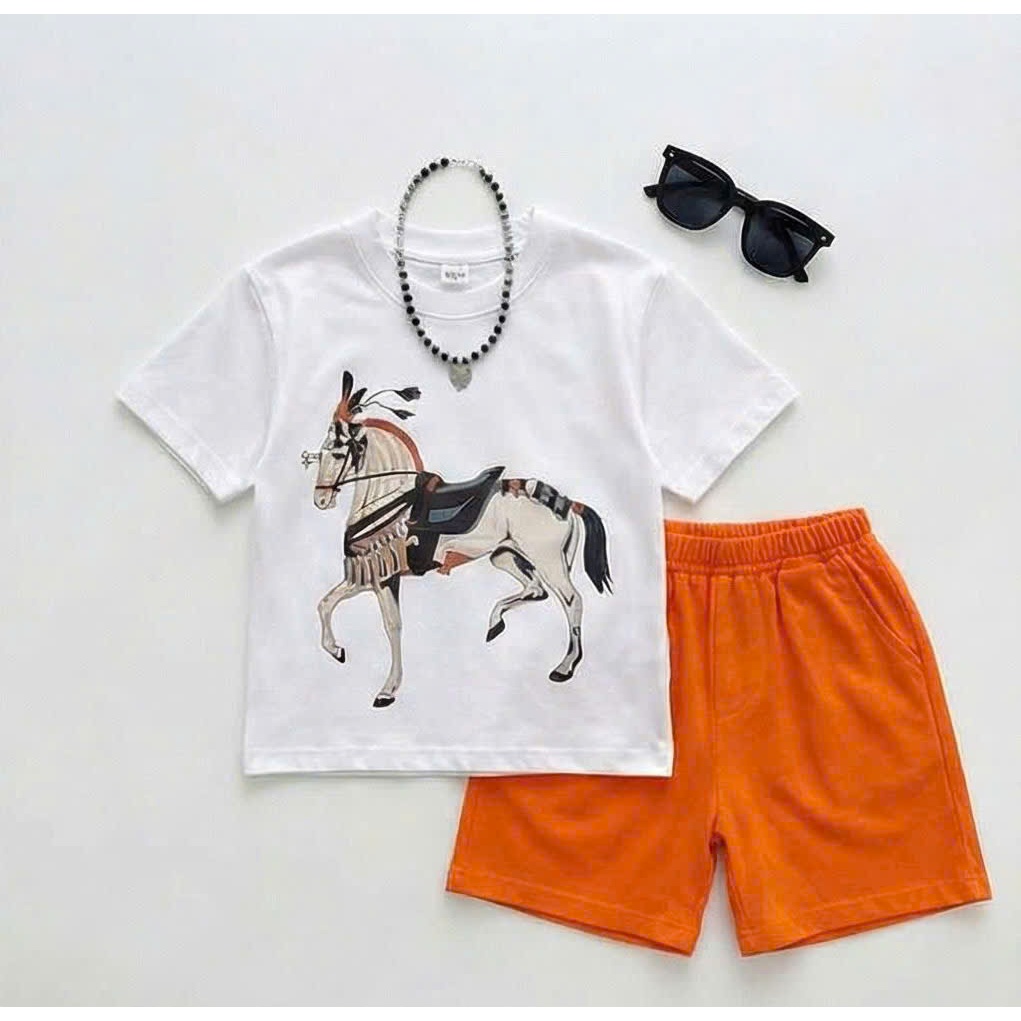 Set Đồ Bé Trai In Ngựa Bính Ngọ 2026 – Áo Thun Quần Đùi Vải Tixi Mát