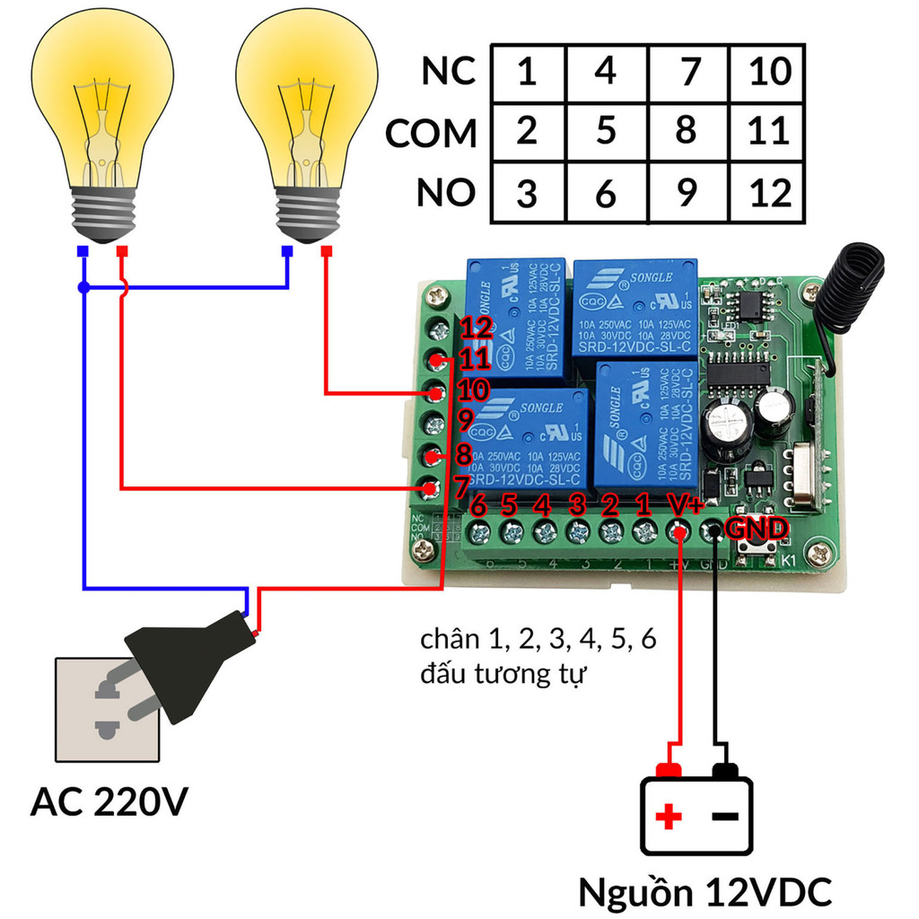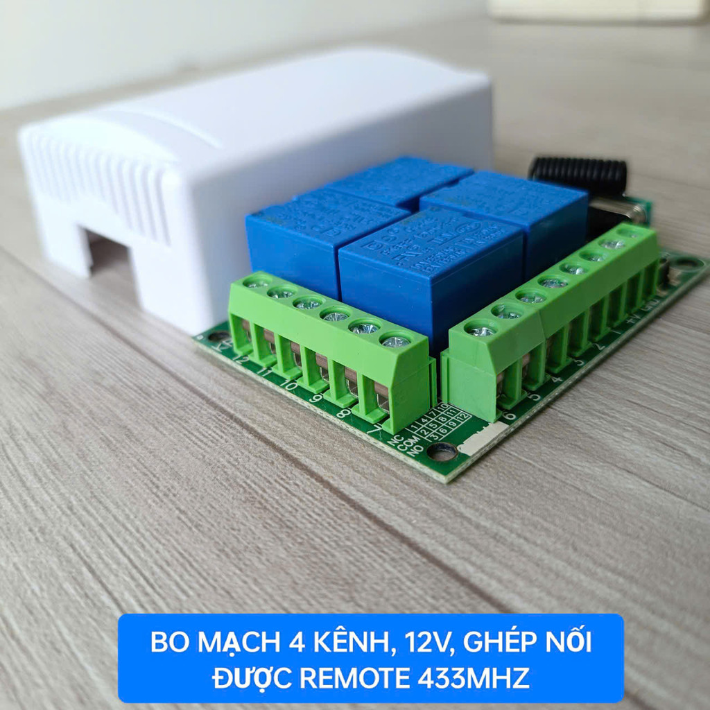 Bộ công tắc điều khiển từ xa 4 kênh 12V 10A tần số 433Mhz kèm remote đen 4 nút ABCD- học lệnh remote