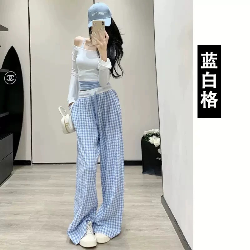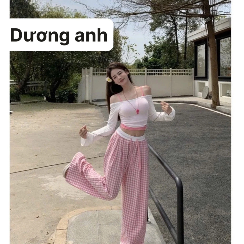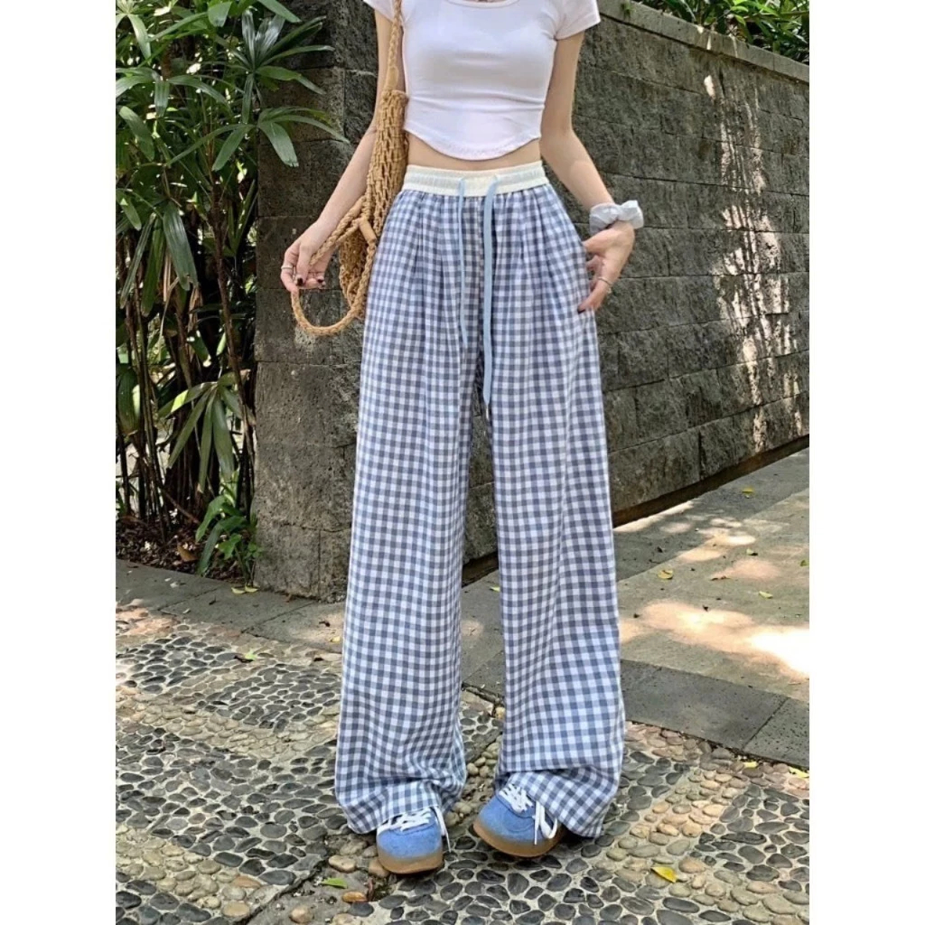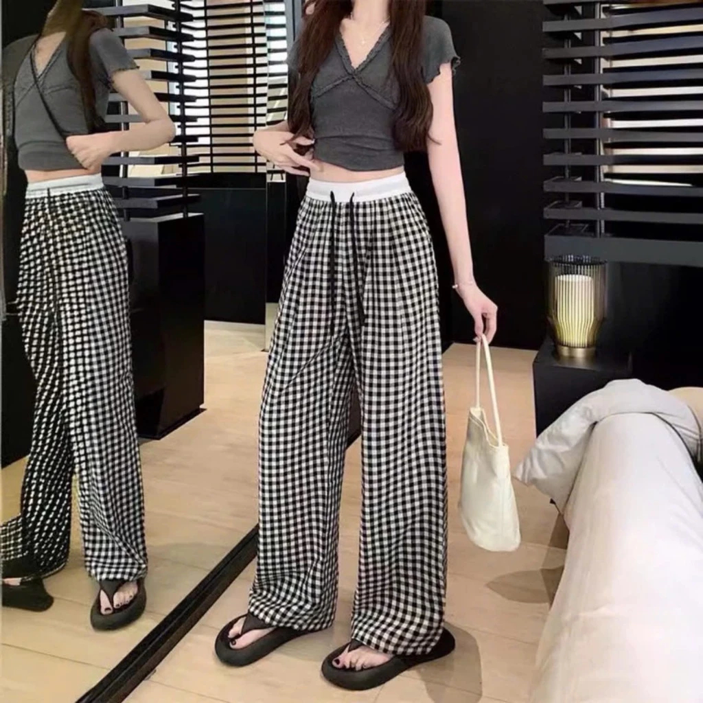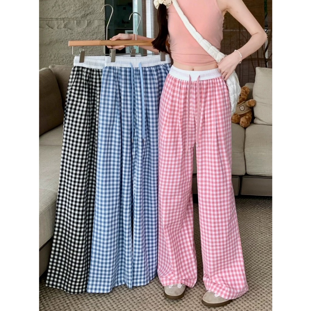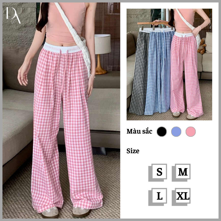 Quần Ống Suông Quần Kẻ Cạp Chun Nữ Dài Rộng Dáng Suông Cạp Cao Phong Cách Hàn Quốc Dài 100-102 CM