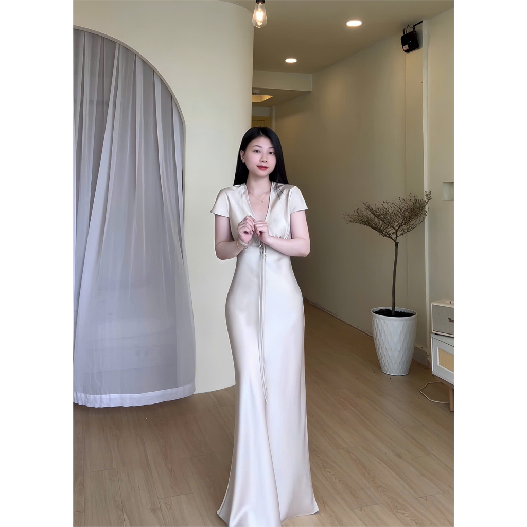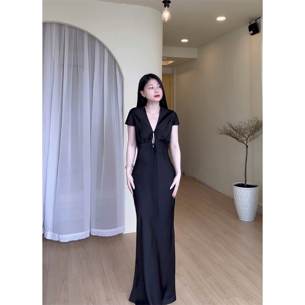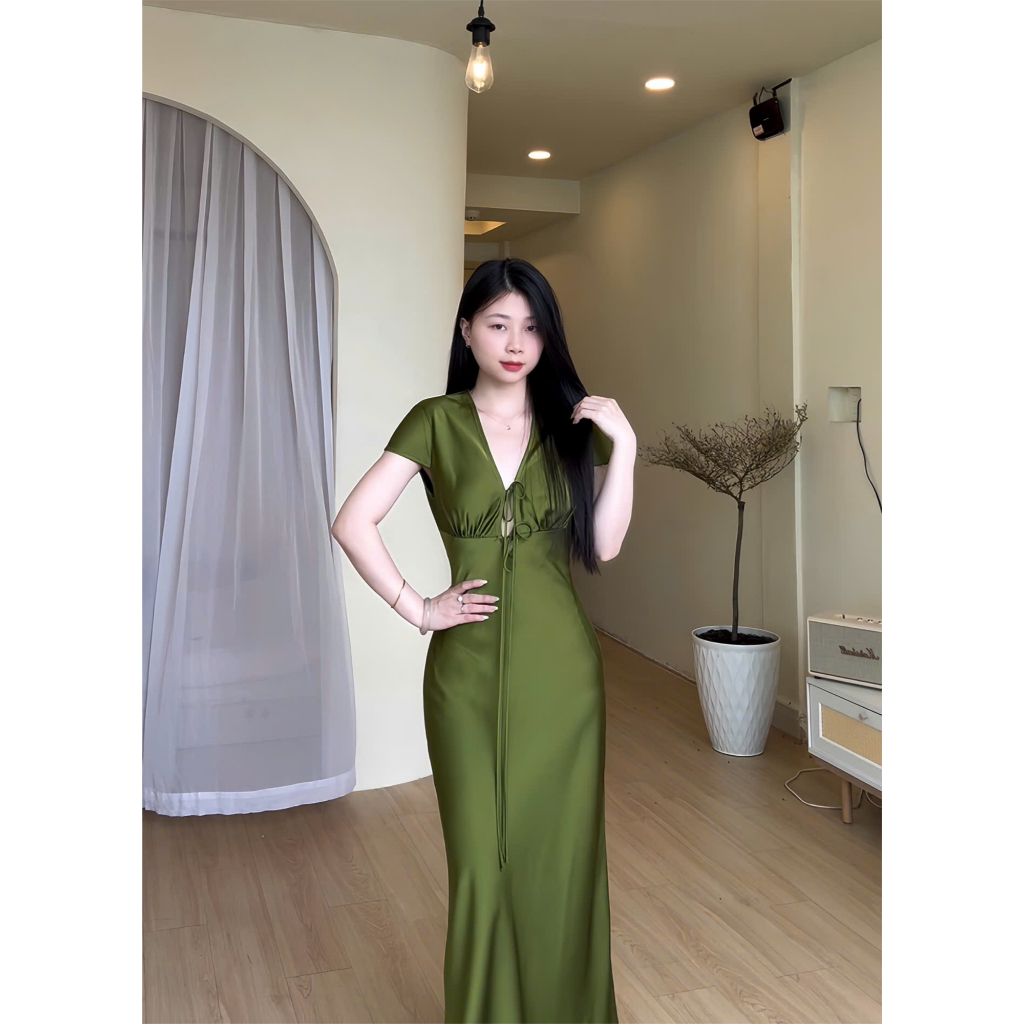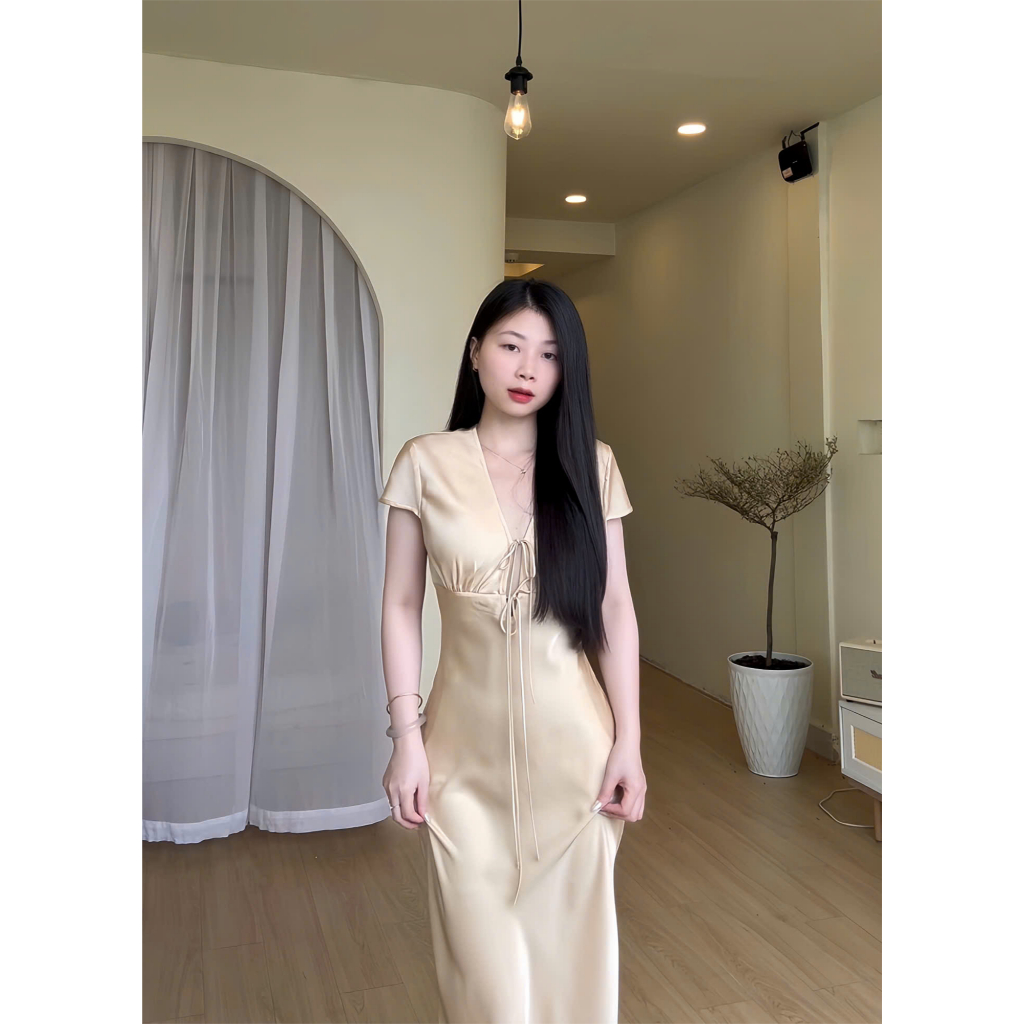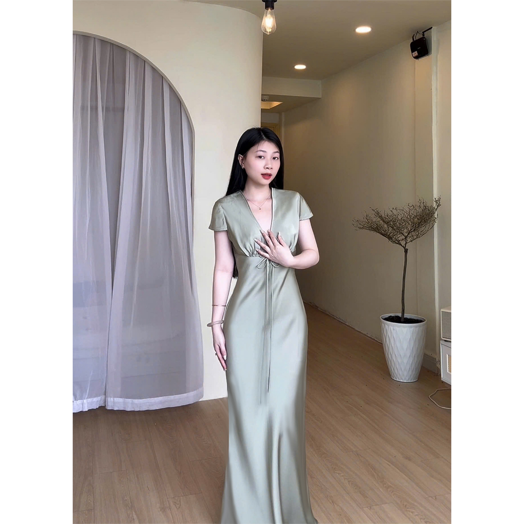 Đầm Lụa Cổ V Cột Dây Form Dài, Váy Lụa 1 Lớp Không Mút, Không Dây Kéo Sang Chảnh Tôn Dáng Gợi Cảm