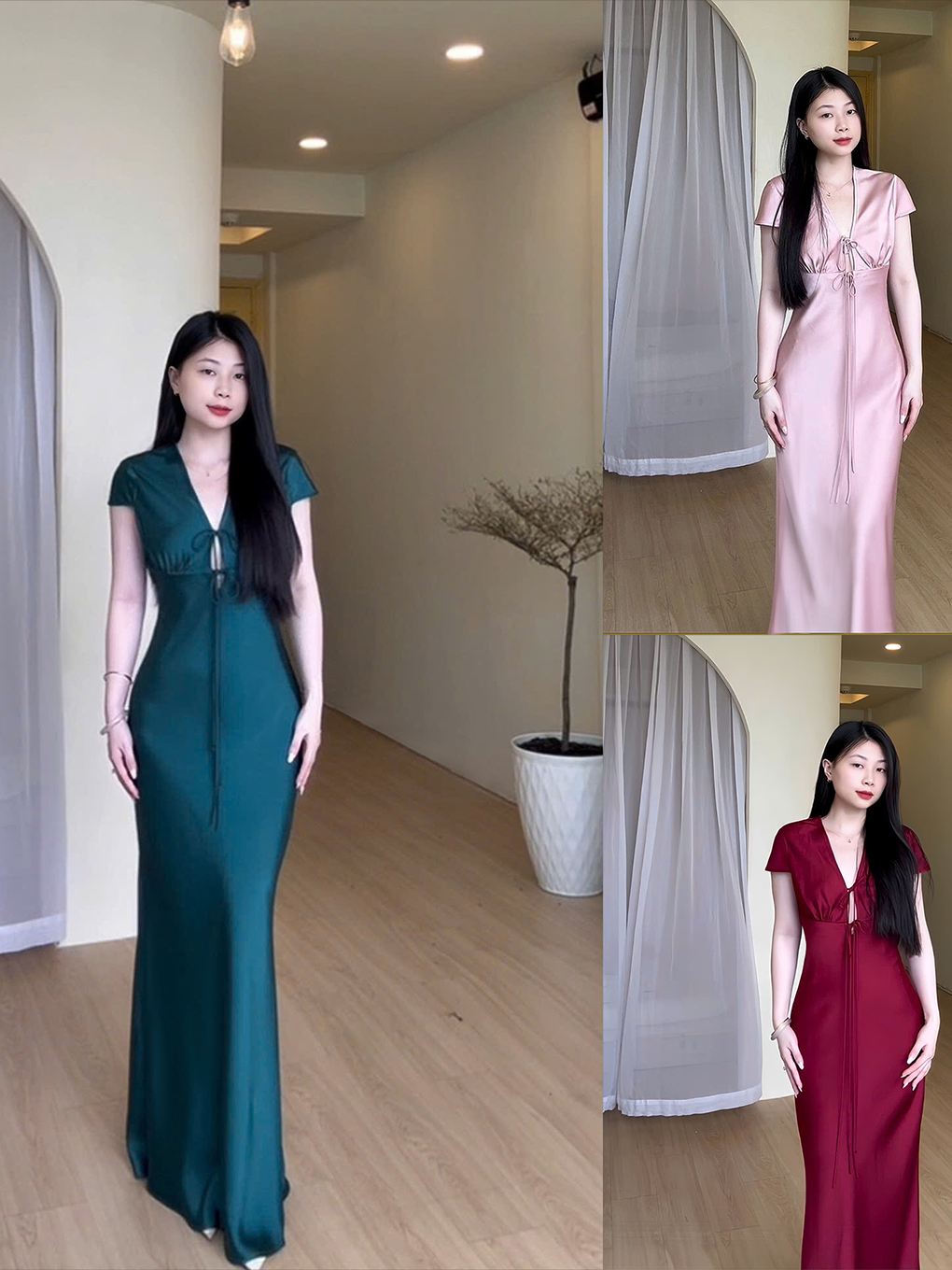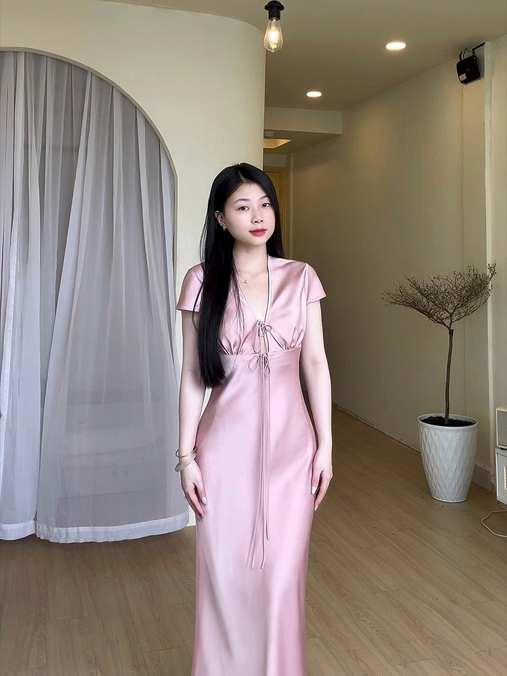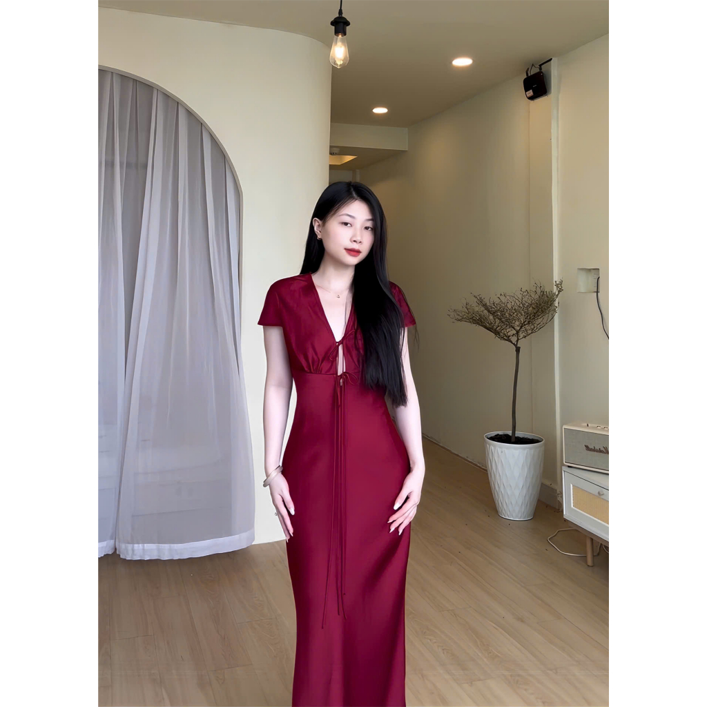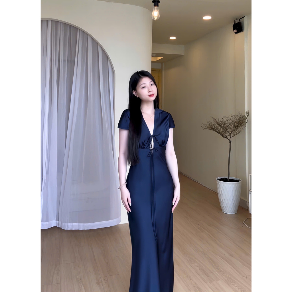 Đầm Lụa Cổ V Cột Dây Form Dài, Váy Lụa 1 Lớp Không Mút, Không Dây Kéo Sang Chảnh Tôn Dáng Gợi Cảm
