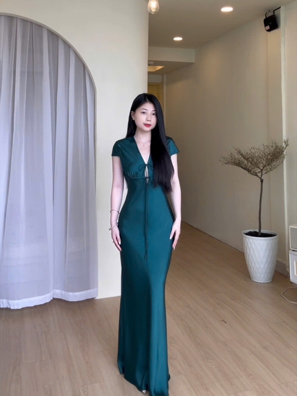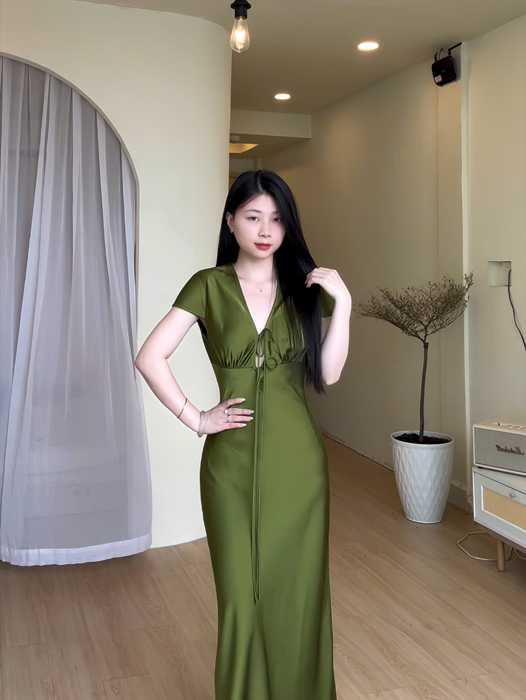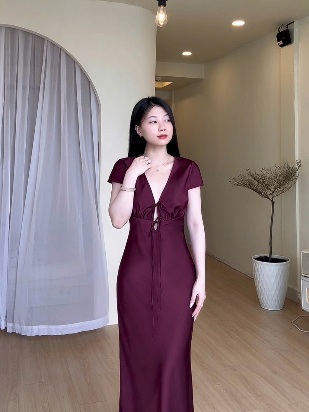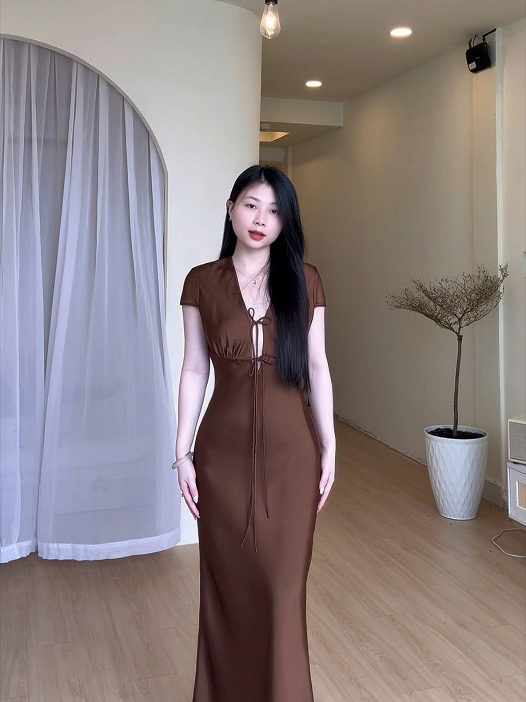 Đầm Lụa Cổ V Cột Dây Form Dài, Váy Lụa 1 Lớp Không Mút, Không Dây Kéo Sang Chảnh Tôn Dáng Gợi Cảm