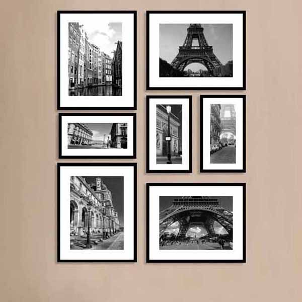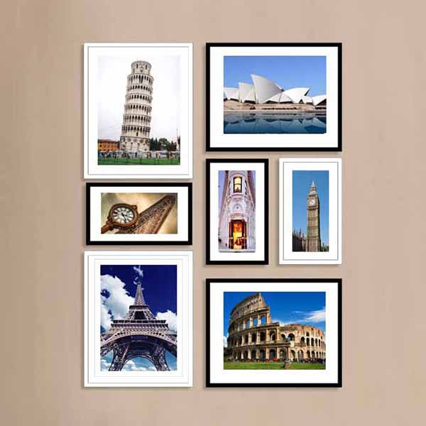 Bộ 7 khung ảnh treo tường góc phòng khách MS071 chủ đề kỳ quan thế giới có màu hoặc đen trắng