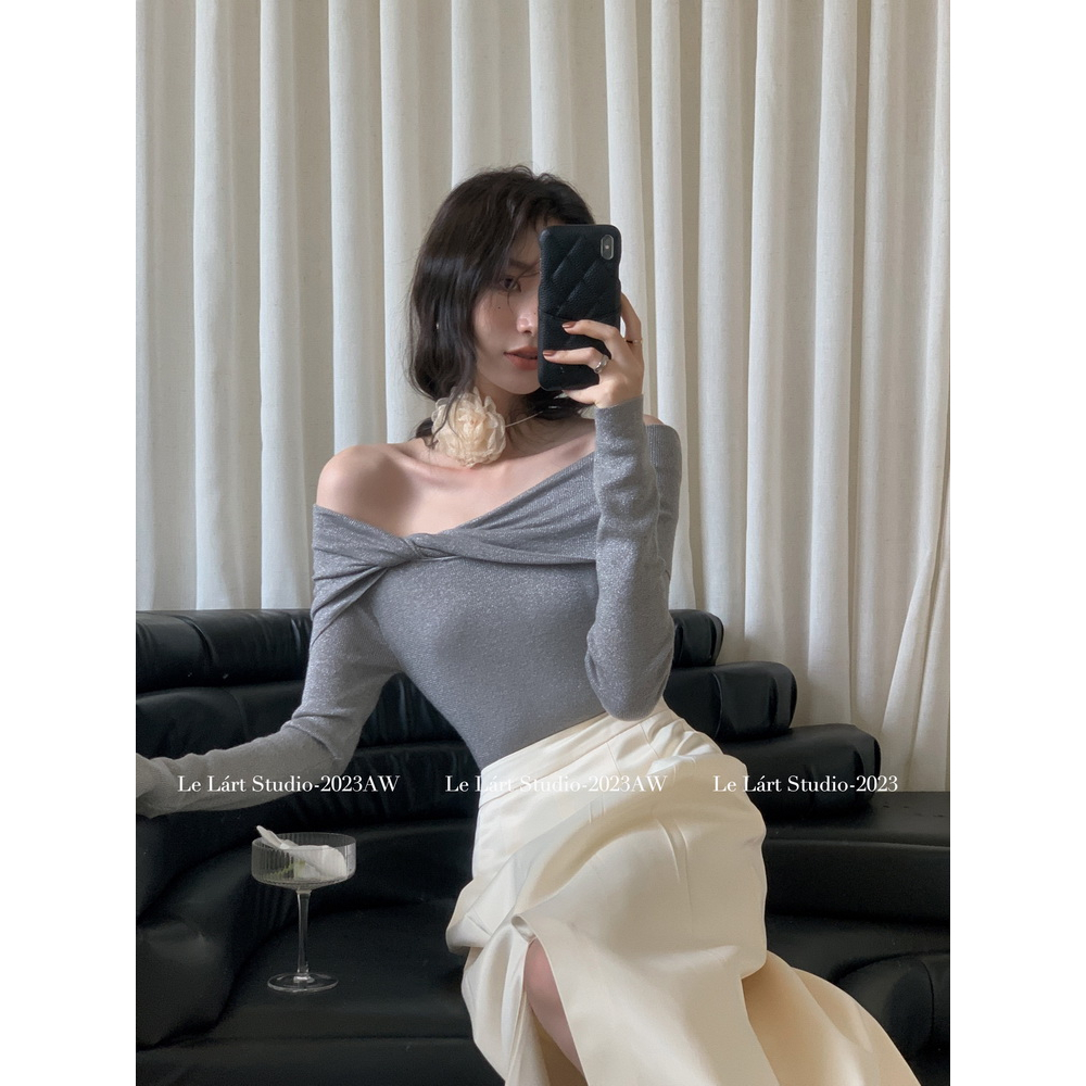 kumikumi Áo len dệt kim dài tay lệch vai dành cho nữ