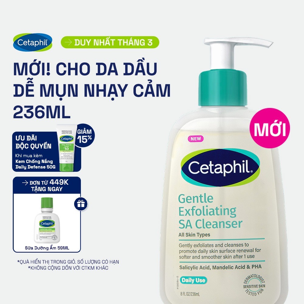 [MỚI] Gel rửa mặt làm sạch dầu nhờn, ngăn mụn cho da dầu nhạy cảm CETAPHIL GENTLE EXFOLIATING SA CLEANSER 236ml