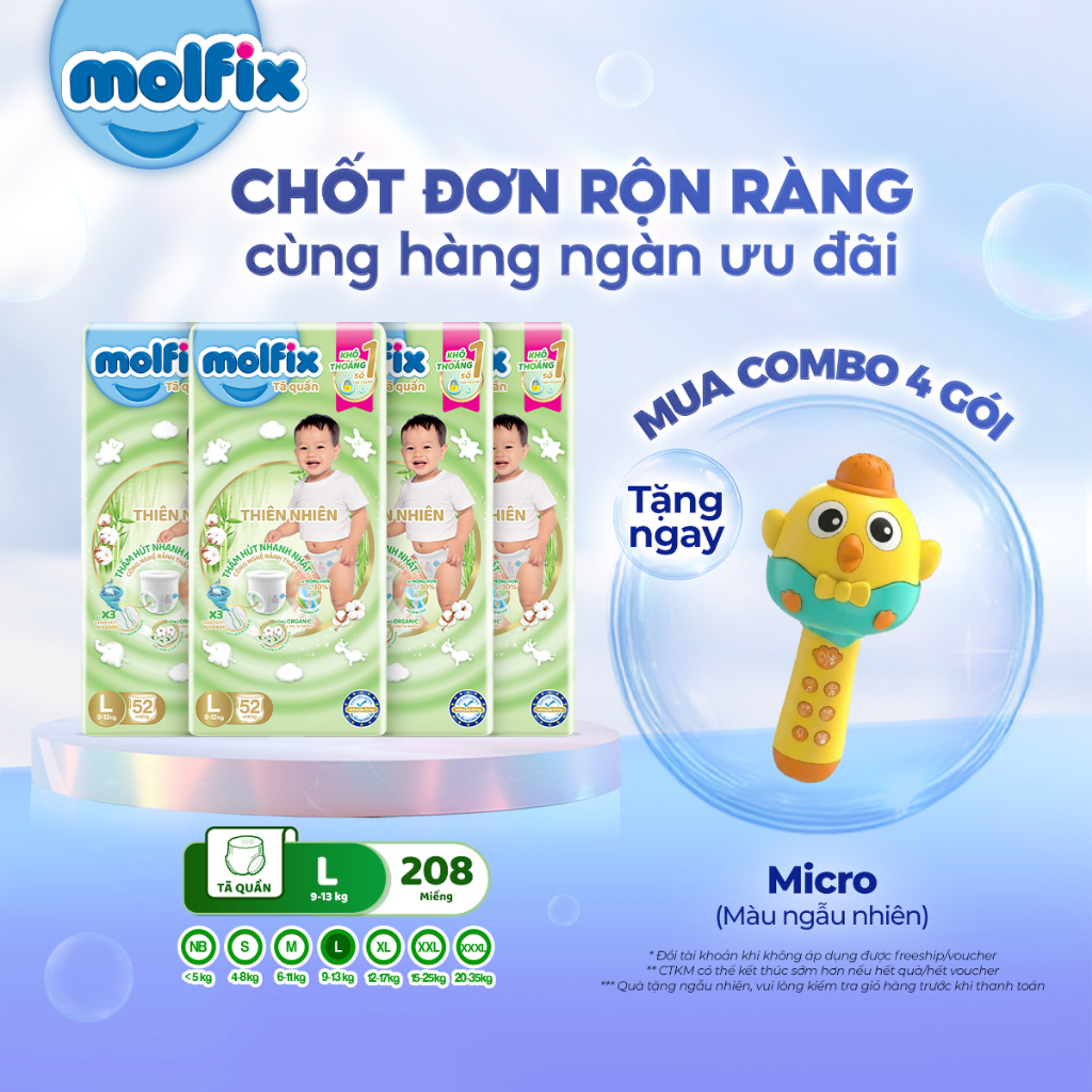 [Tặng Micro Nhạc Hát] Combo 4 Tã/bỉm quần Molfix Thiên nhiên Super Jumbo đủ size M56/L52/XL46/XXL42