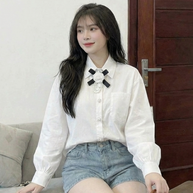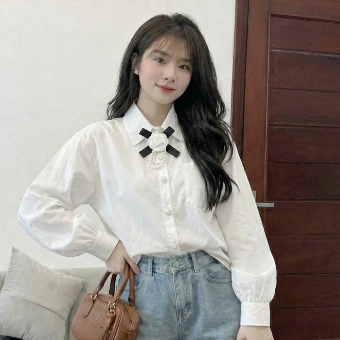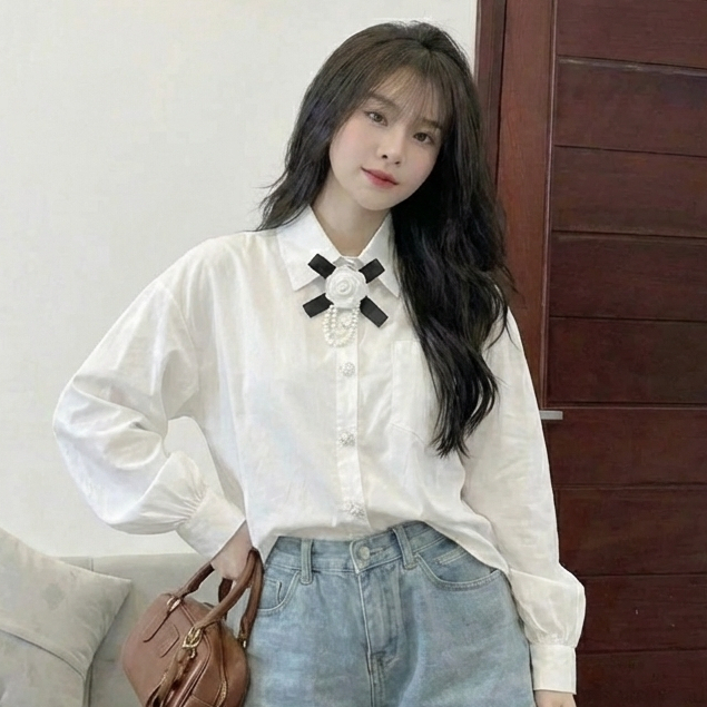 B1 - Áo Sơ Mi Dài Tay Form Rộng Phối Nơ Hoa Đính Cúc Ngọc