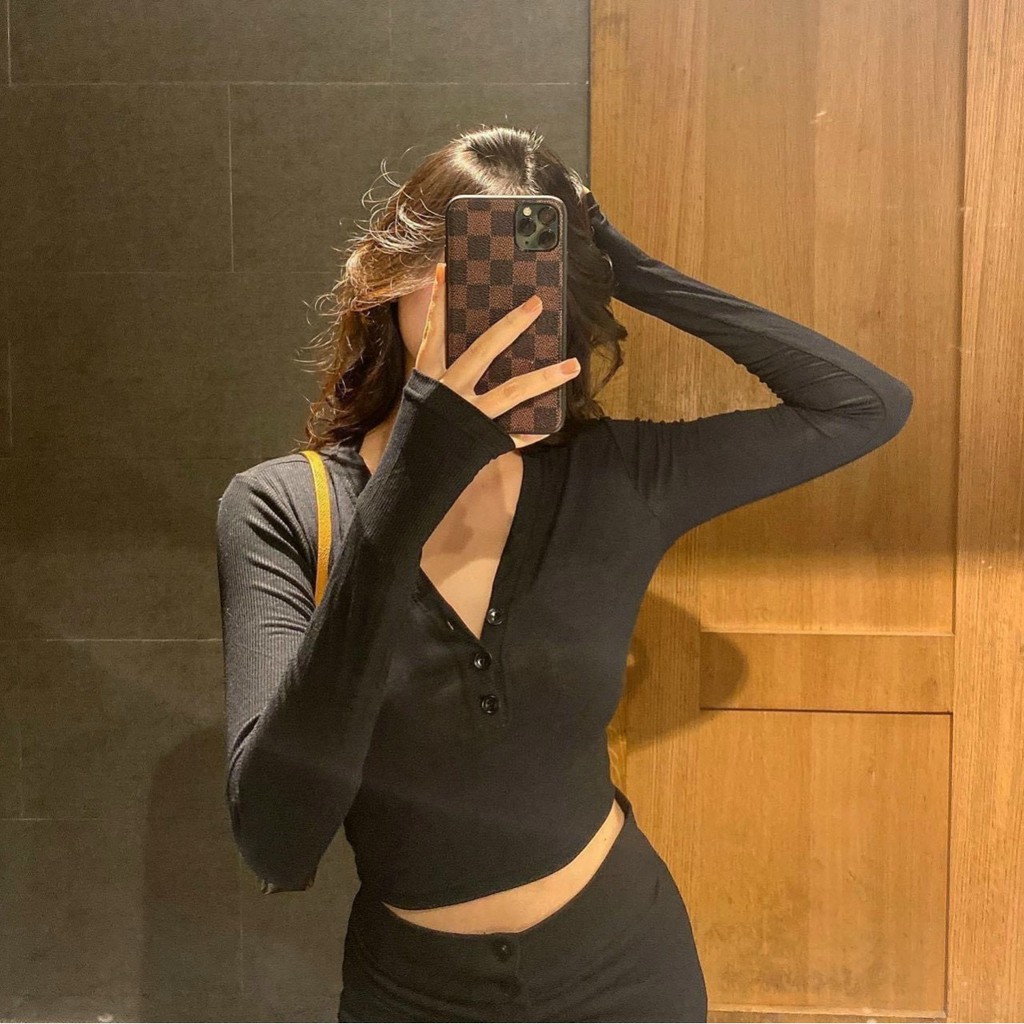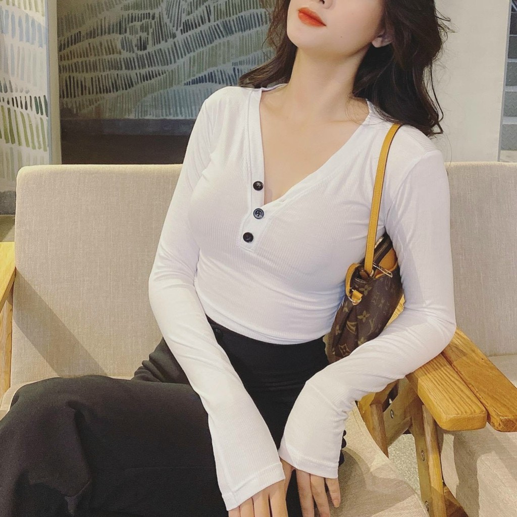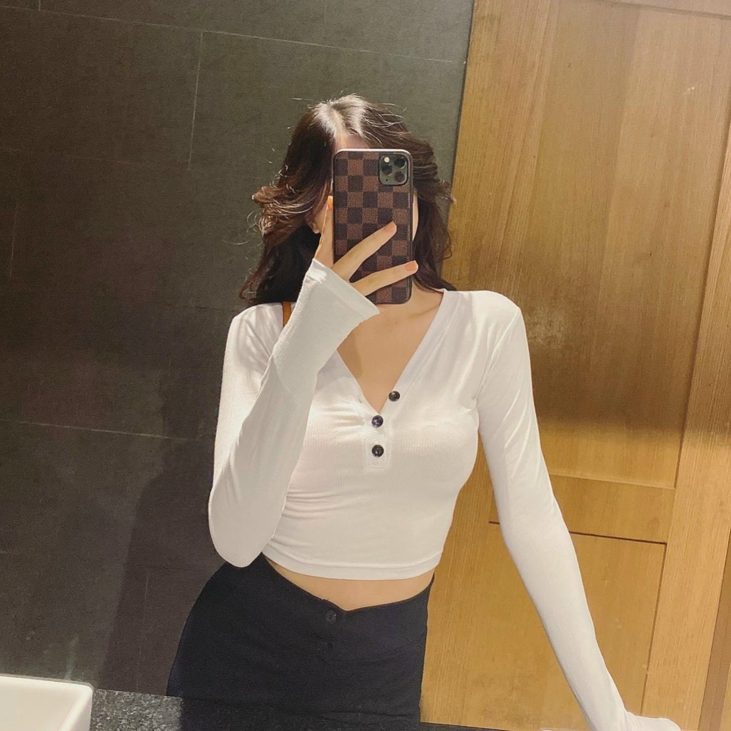 Áo cổ tim nút tay dài siêu xinh ( ảnh thật )