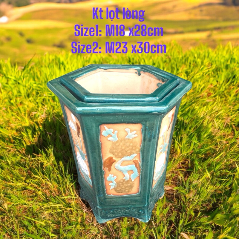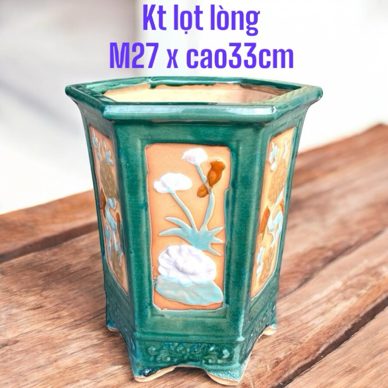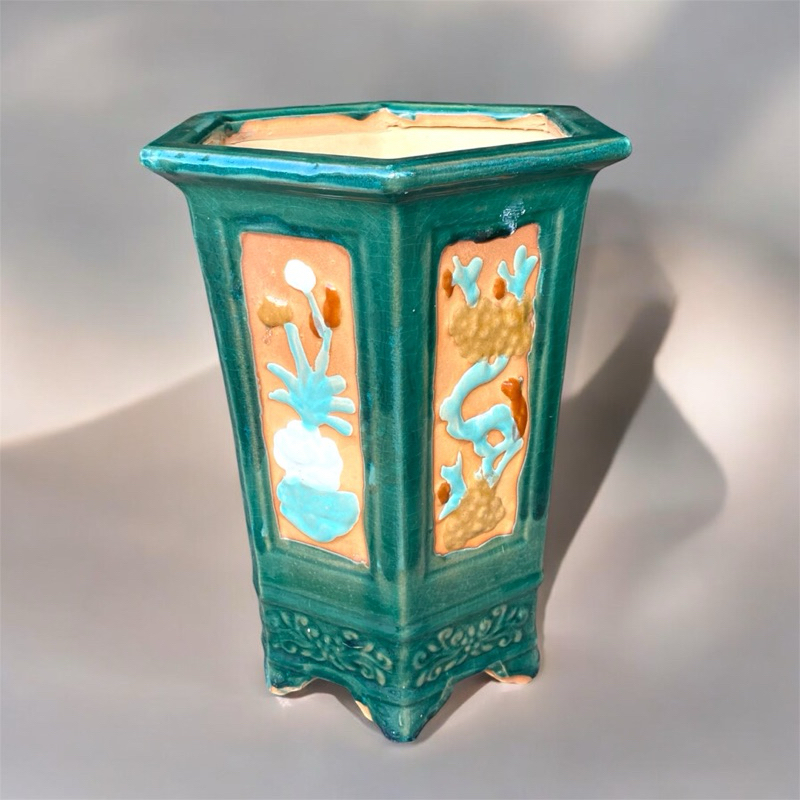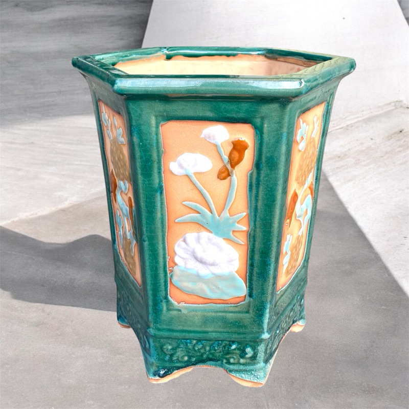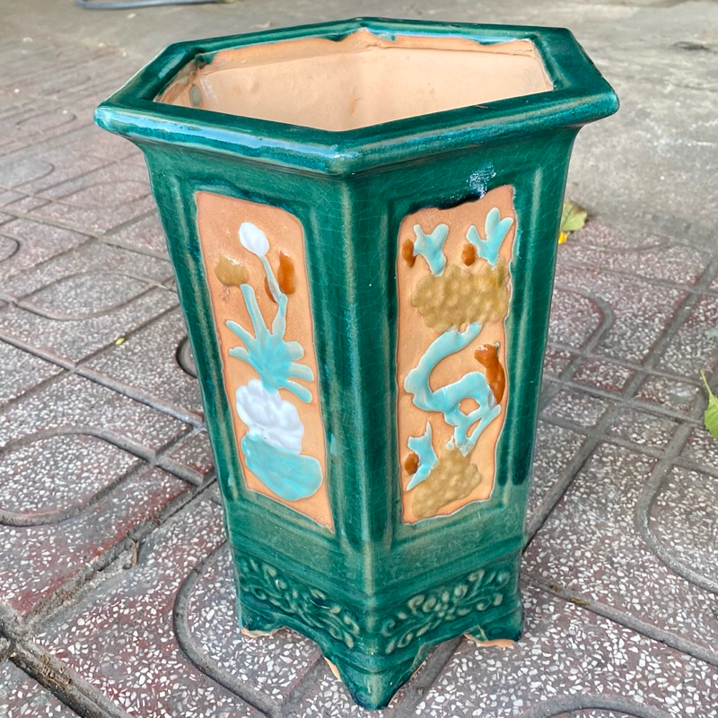 Chậu lục giác cao men xanh đào trúc cúc mai giả cổ, chậu dày, nặng tay