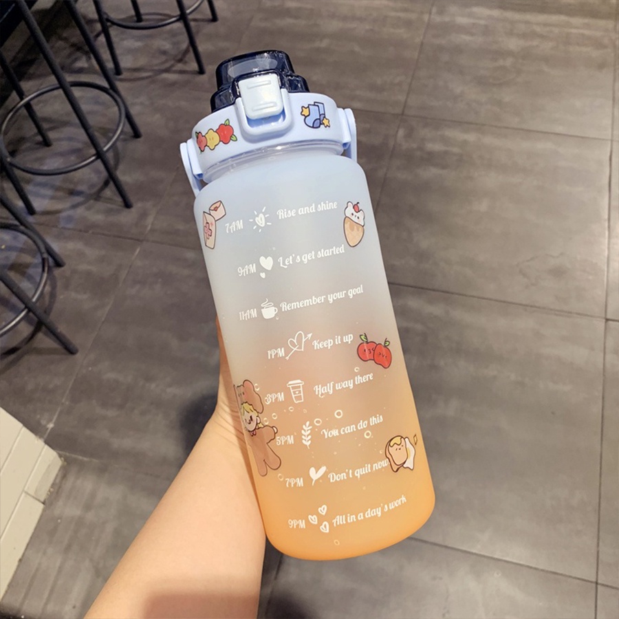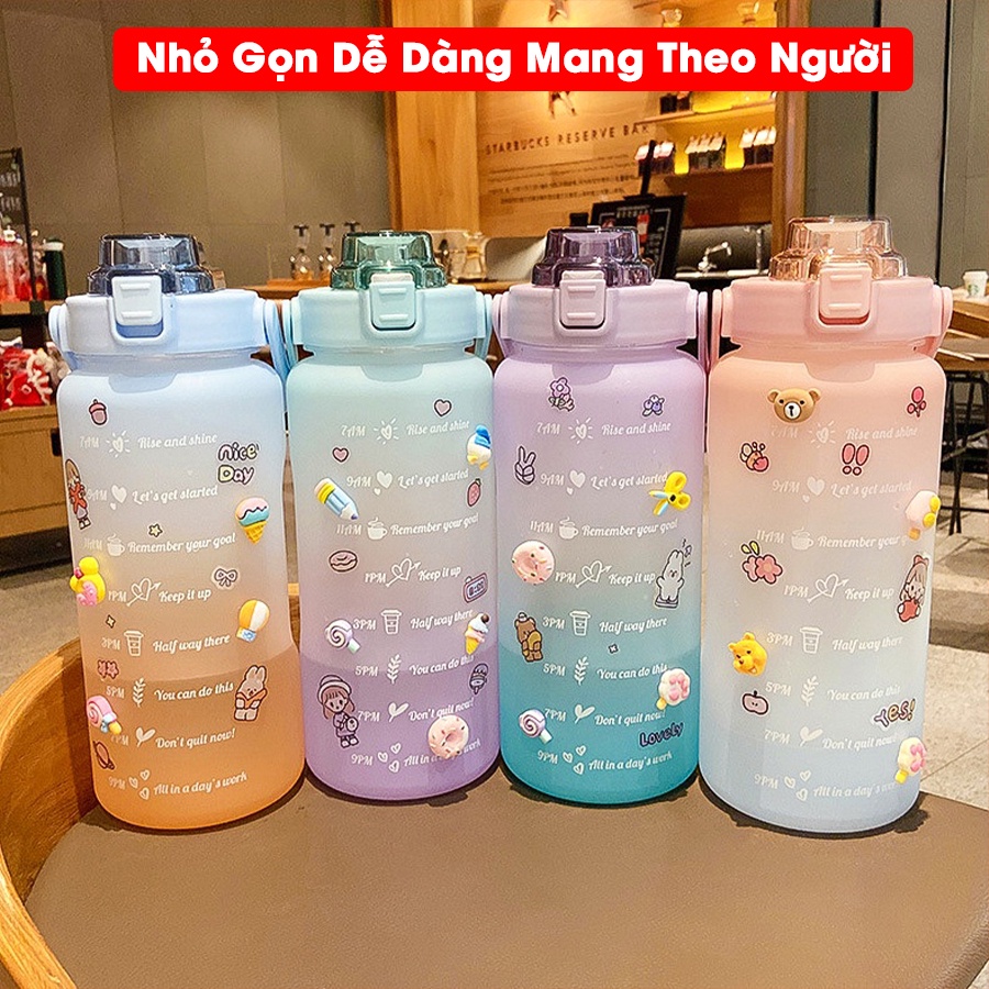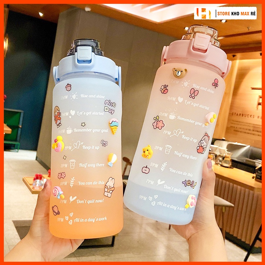 Bình Nước Cute 2L Hàng Loại 1 Vỏ Nhựa Dày, Bình Nước Dễ Thương Chia Vạch Báo Giờ Uống Nước Có Sticker Dễ Thương