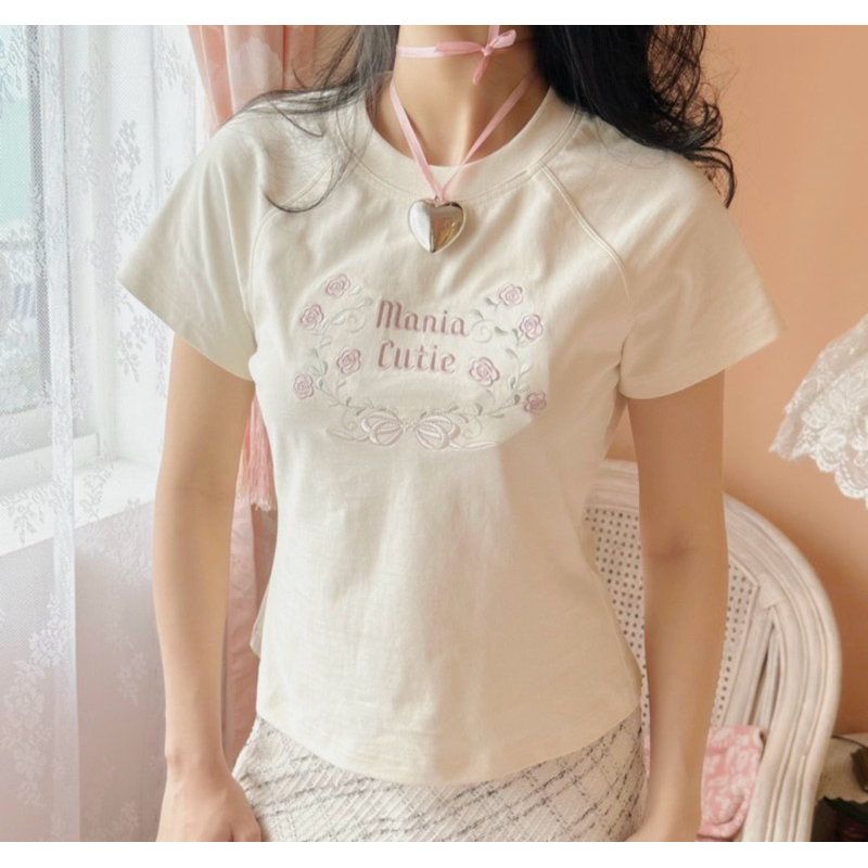 áo thun babytee/boxy raglan Mania Tee màu kem thêu vintage retro coquette barbiecore
