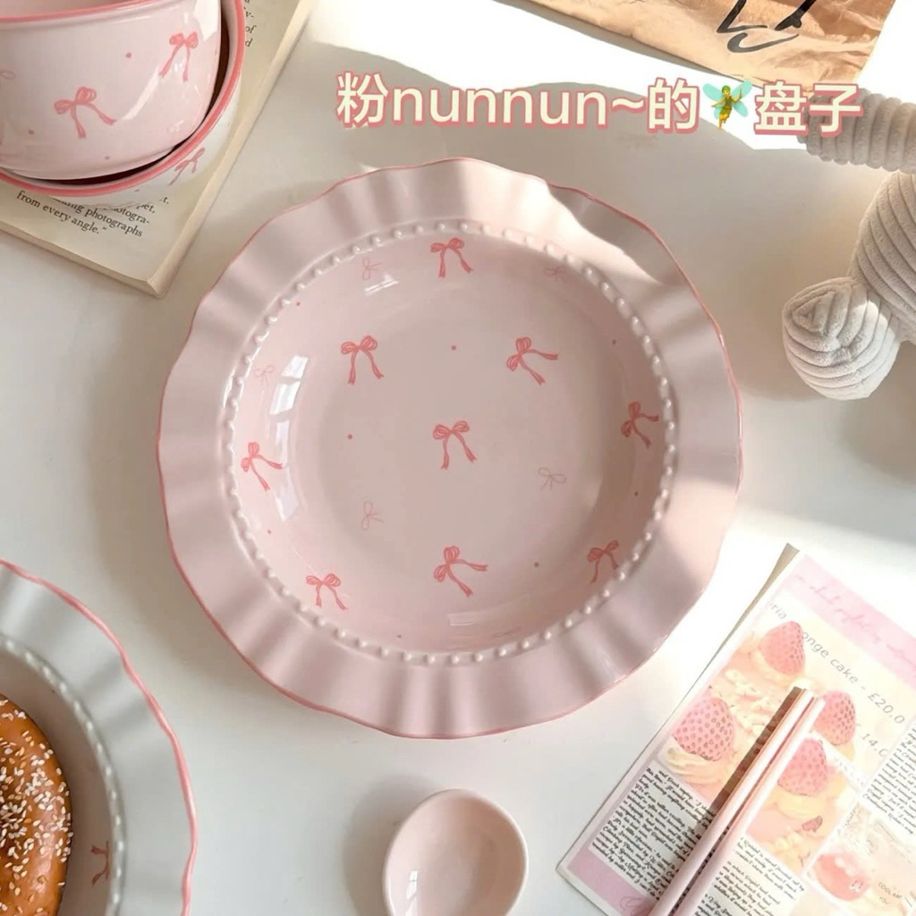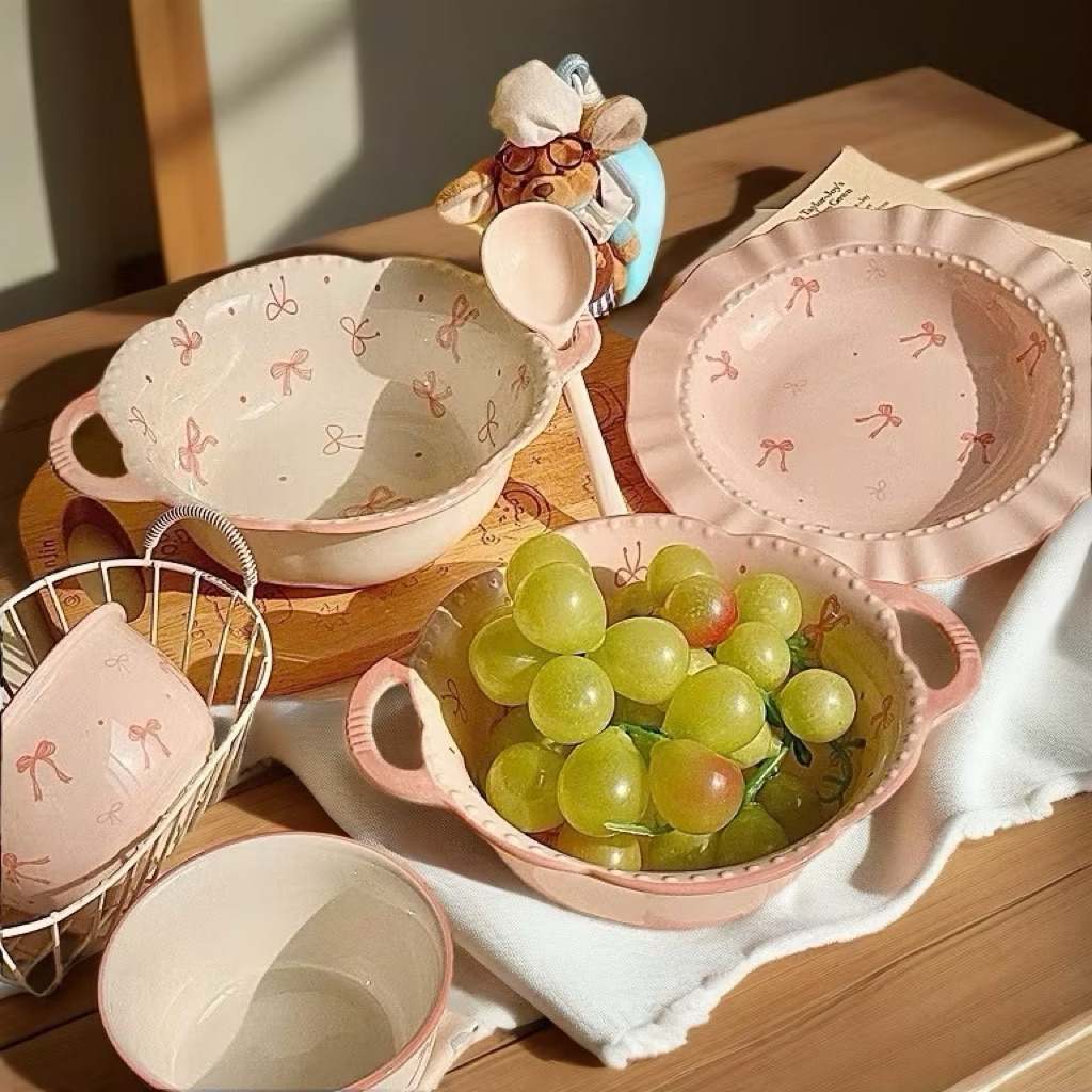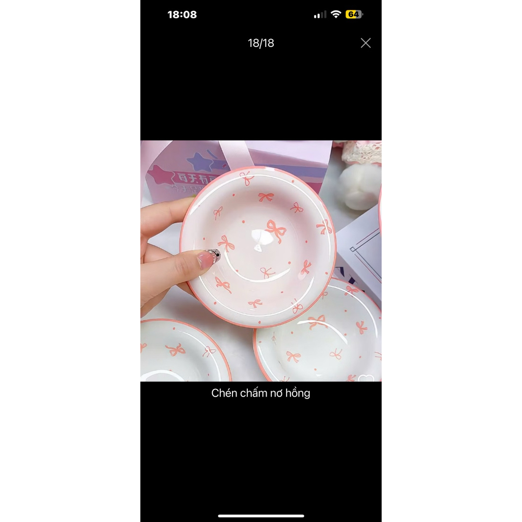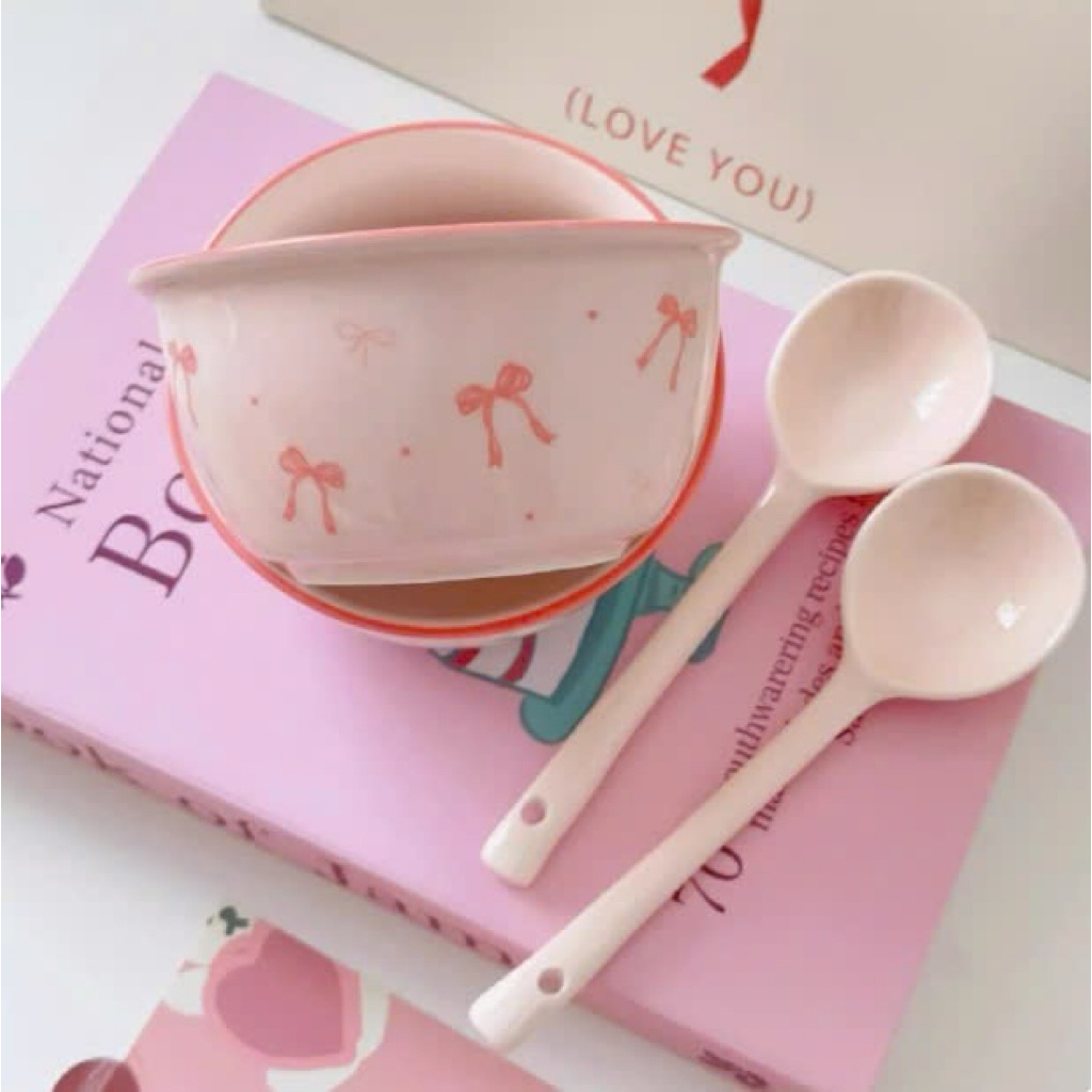 Bộ chén bát, tô, dĩa, muỗng sứ màu hồng hoạ tiết nơ hồng