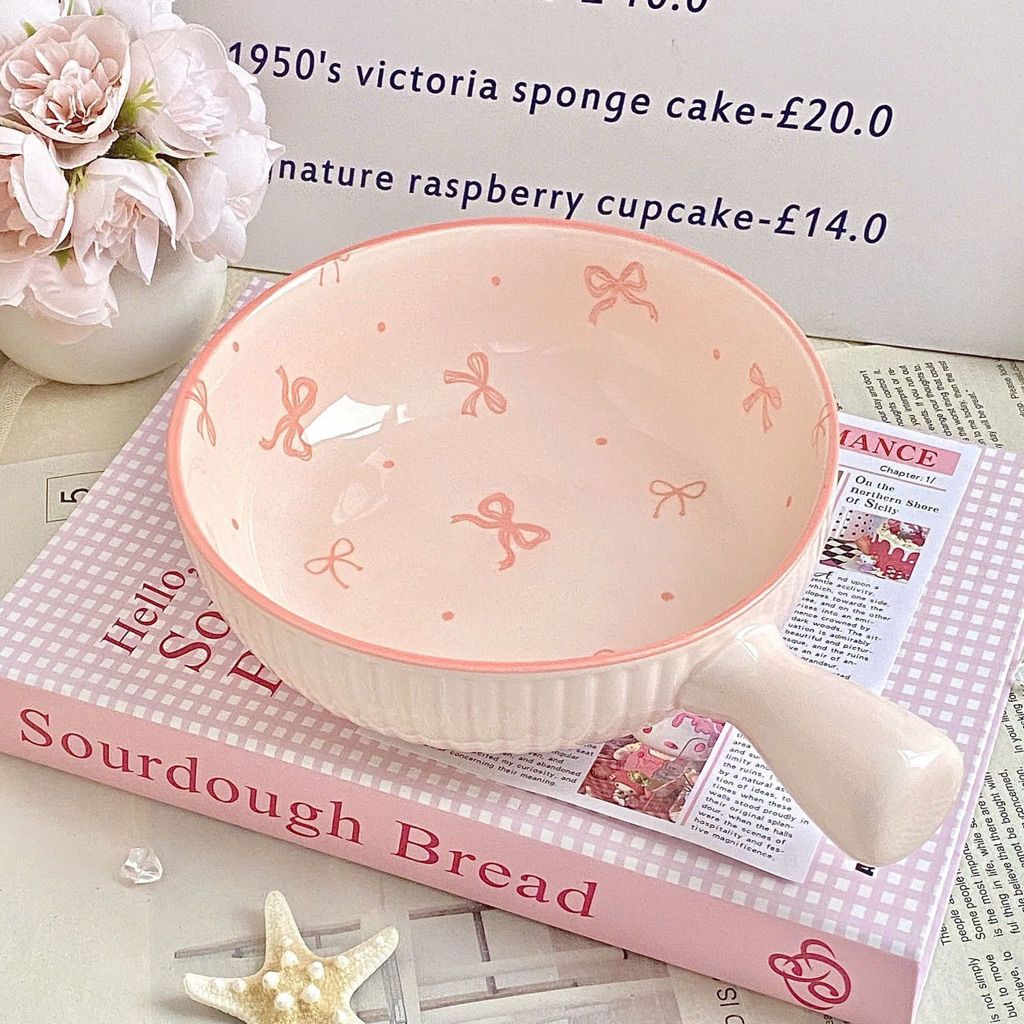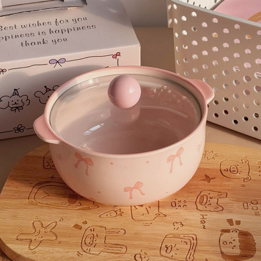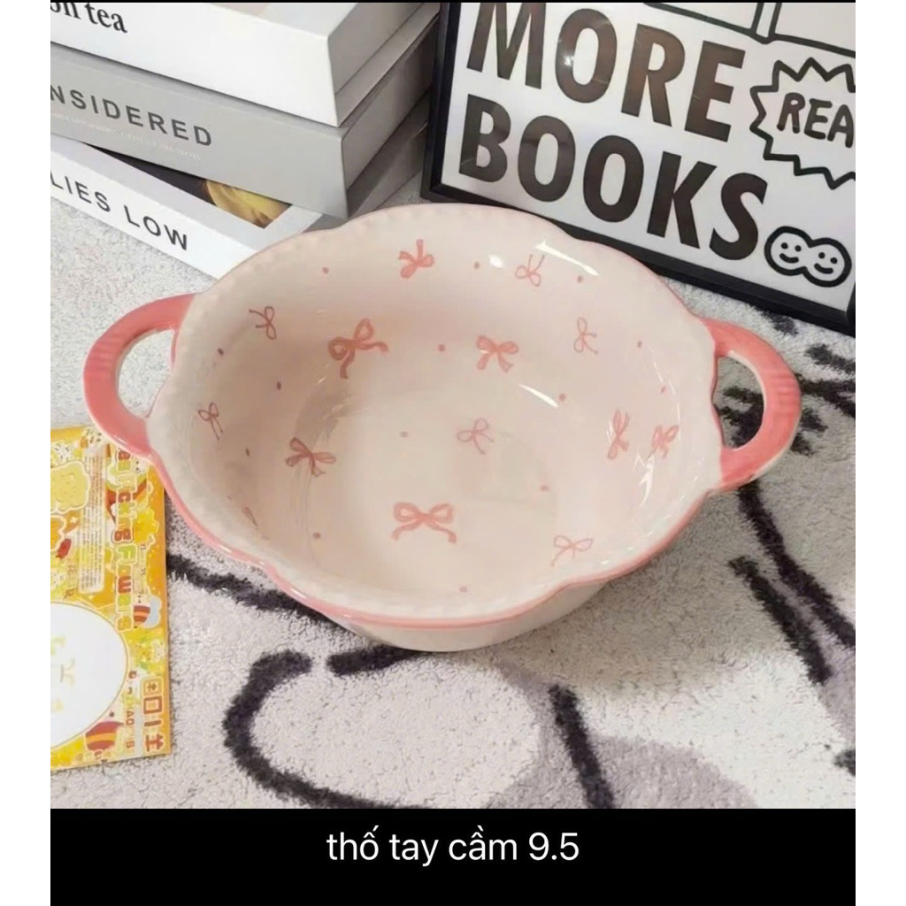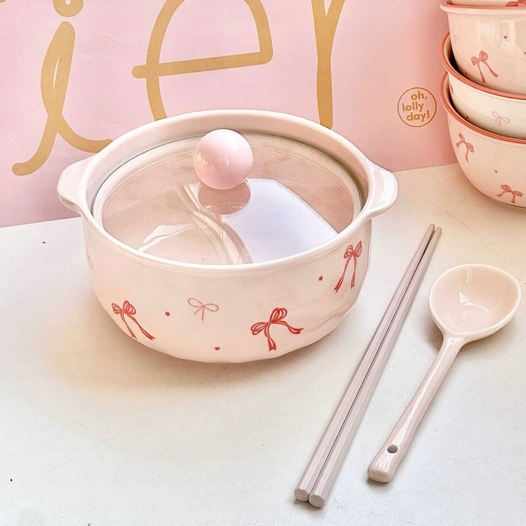 Bộ chén bát, tô, dĩa, muỗng sứ màu hồng hoạ tiết nơ hồng