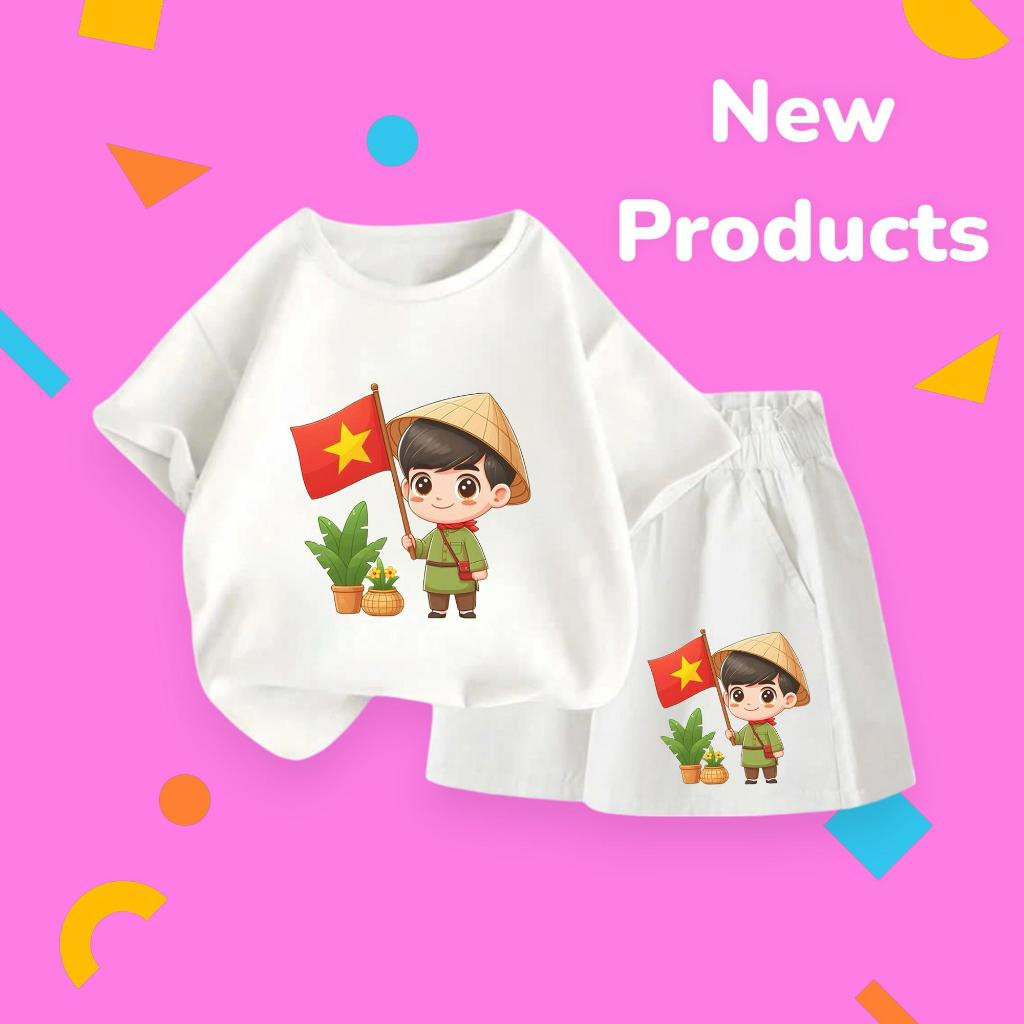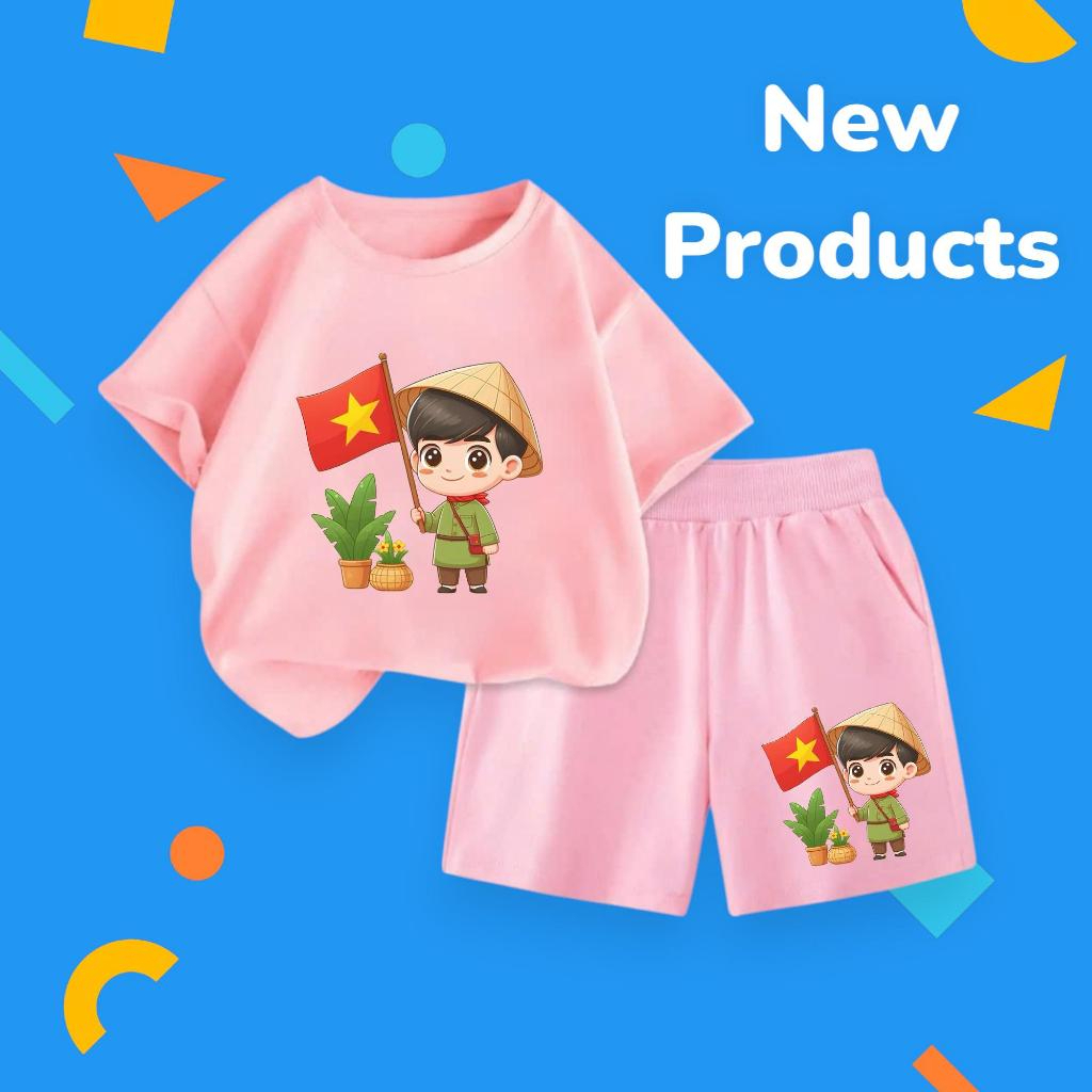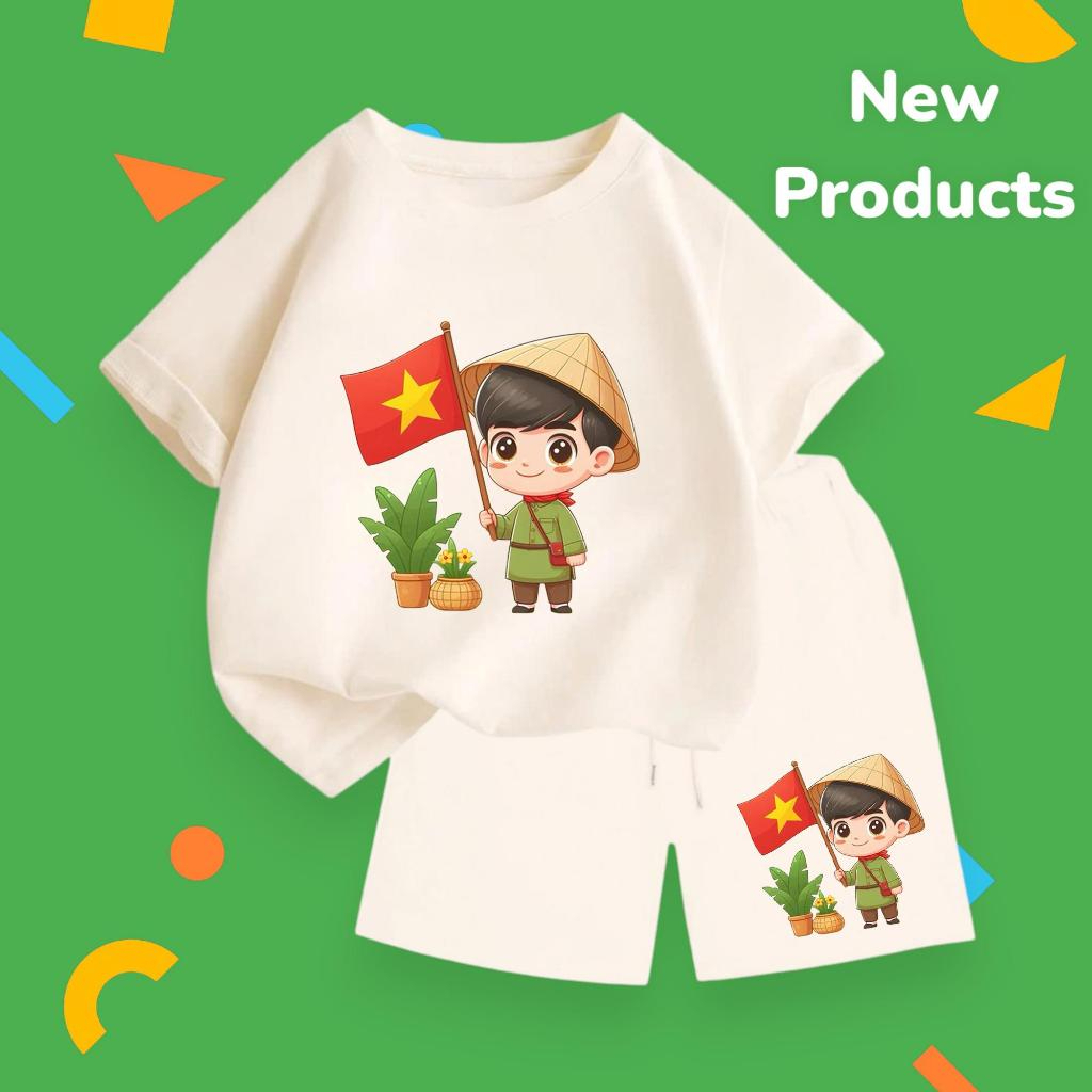Bộ cộc tay cho bé – In bé trai áo xanh cầm cờ Việt Nam, cotton mềm mịn, mặc mát cả ngày (M 227)