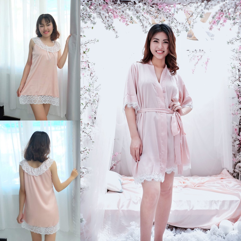 Combo áo choàng +váy ngủ lụa cao cấp tặng kèm chip -Màu Hồng Pastel