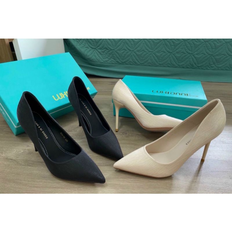 giày cao gót gót nhọn da mịn đen kem