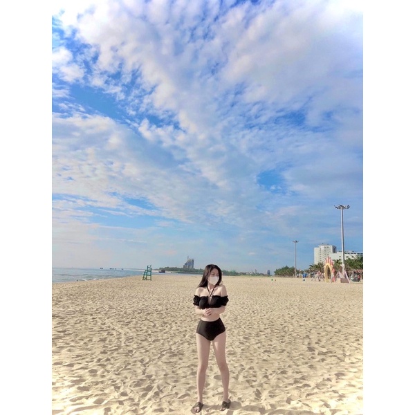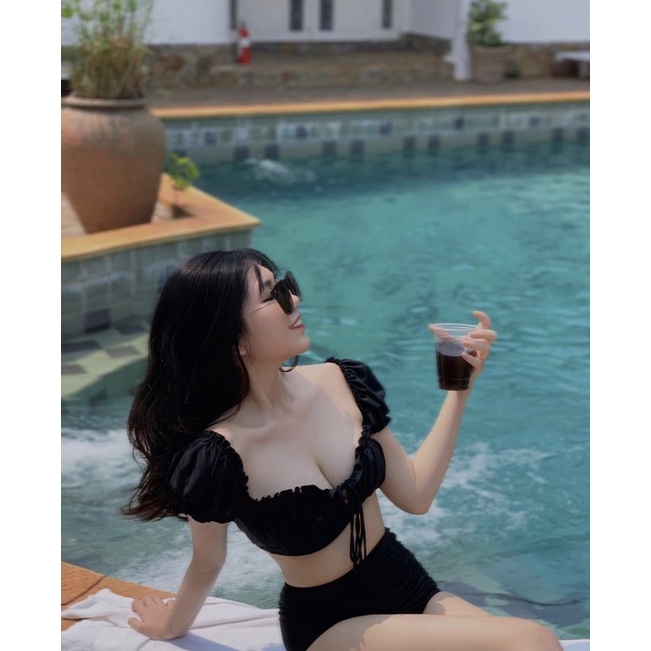 Bikini 2 mảnh tay nhún bèo quần lưng cao che bụng