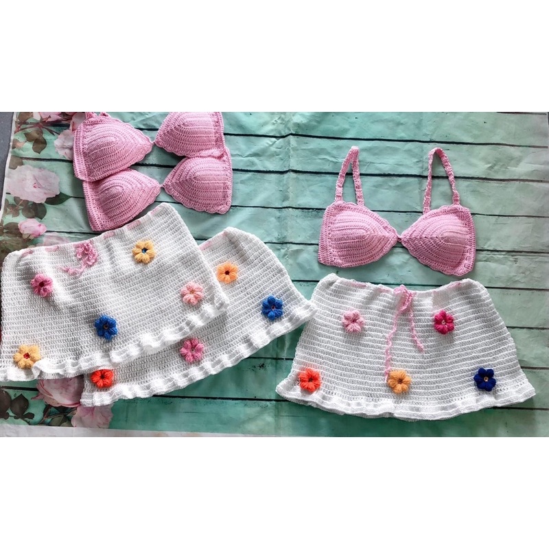 SET BIKINI LEN MÓC HANDMADE ÁO HỒNG CHÂN VÁY TRẮNG ĐÍNH HOA SIÊU ĐẸP (CÓ SẴN) HIMI166
