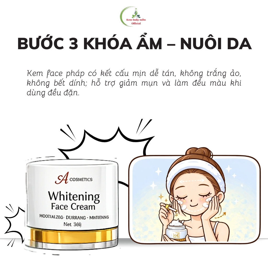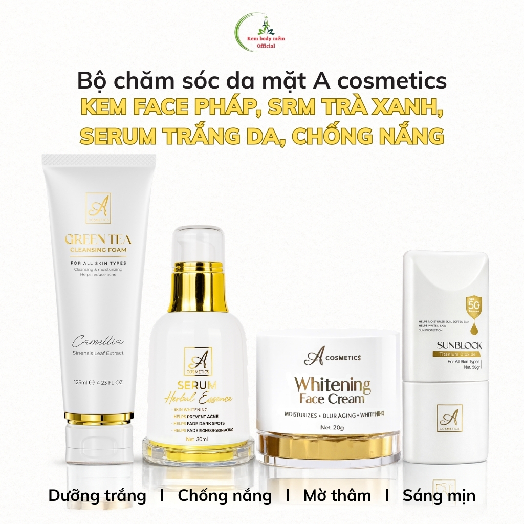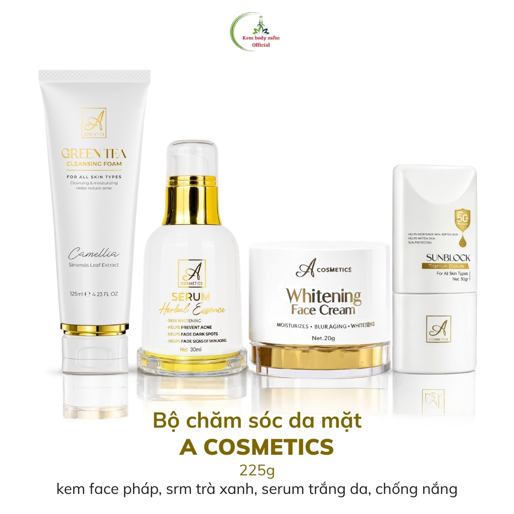 Bộ chăm sóc da mặt A cosmetics 225g, kem face pháp, srm trà xanh, serum trắng da, chống nắng spf50+