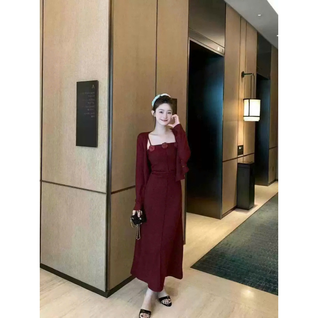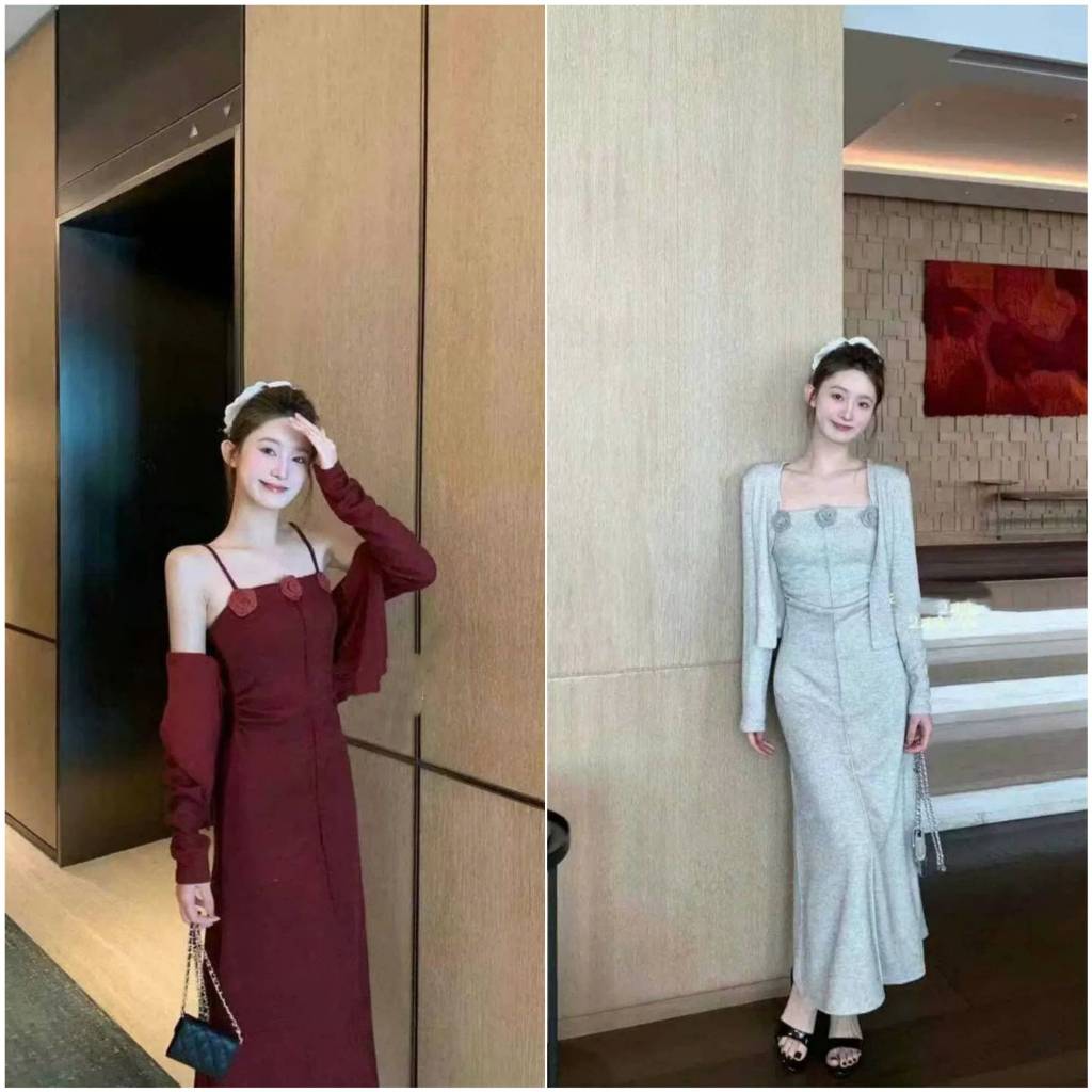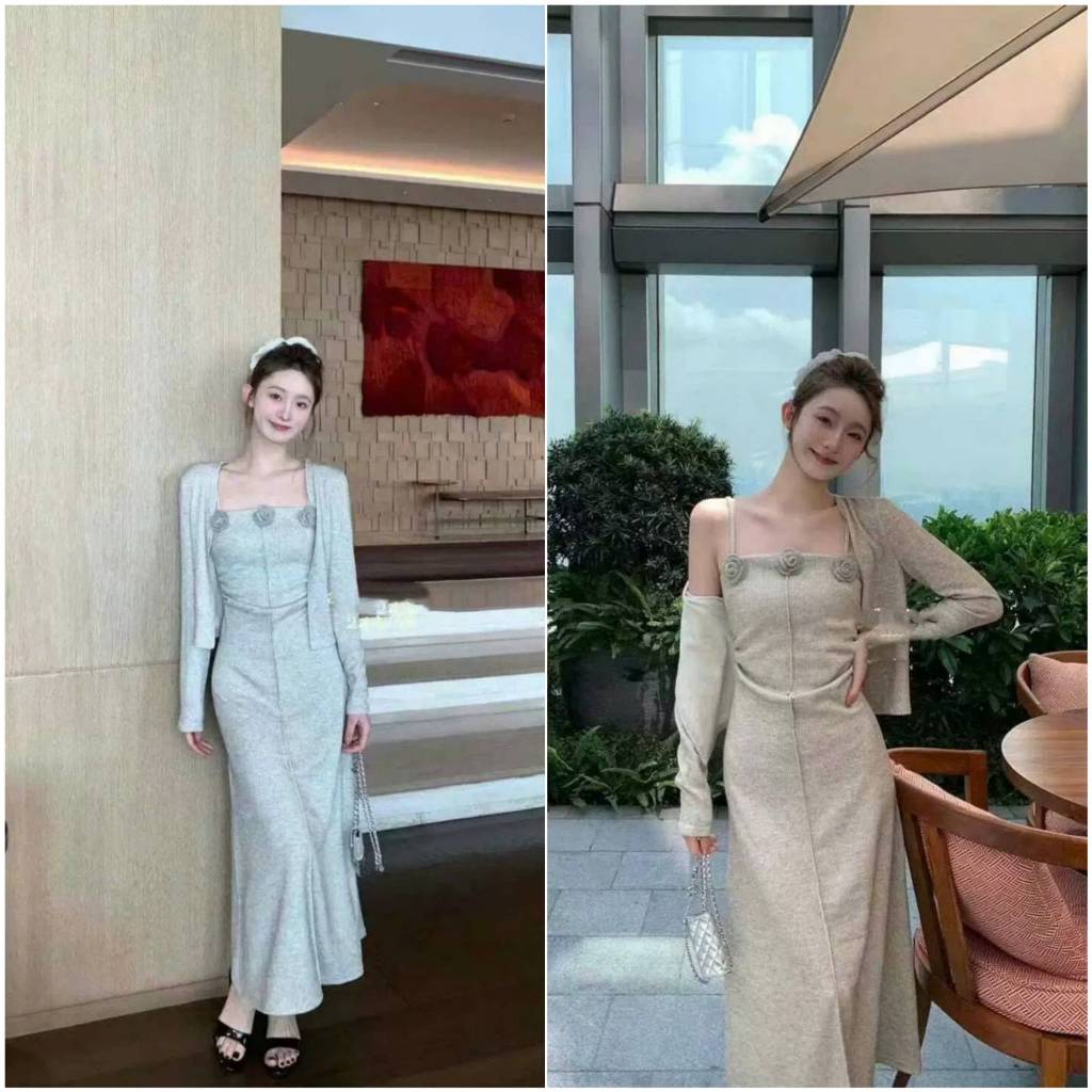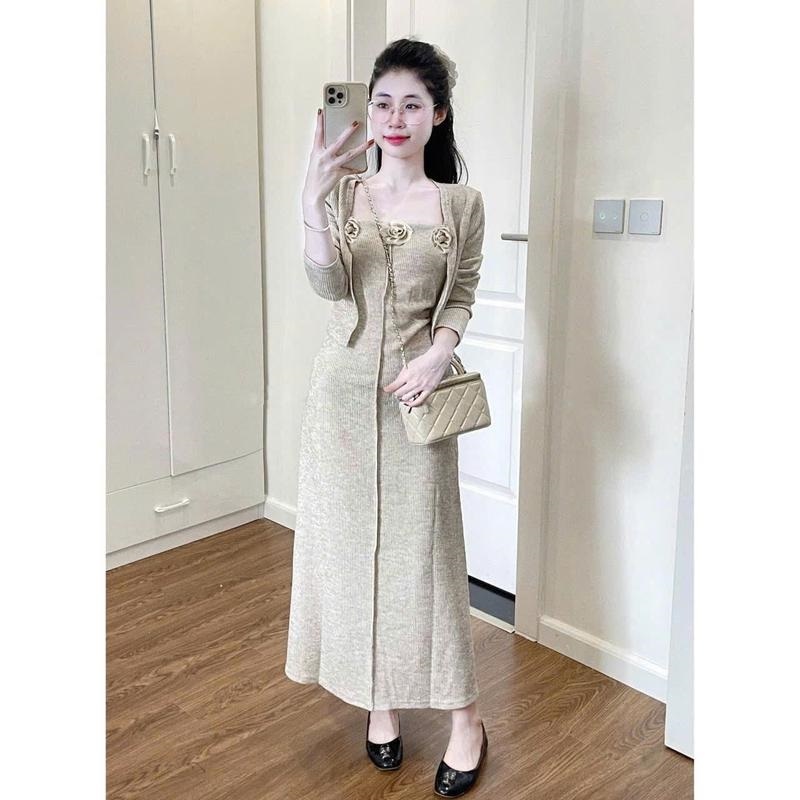 Set Váy Hoa Nổi 2 Dây Kèm Áo Khoác Ngoài, Đầm Body Len Gân Đính Hoa Mix Áo Cardigan Dài Tay