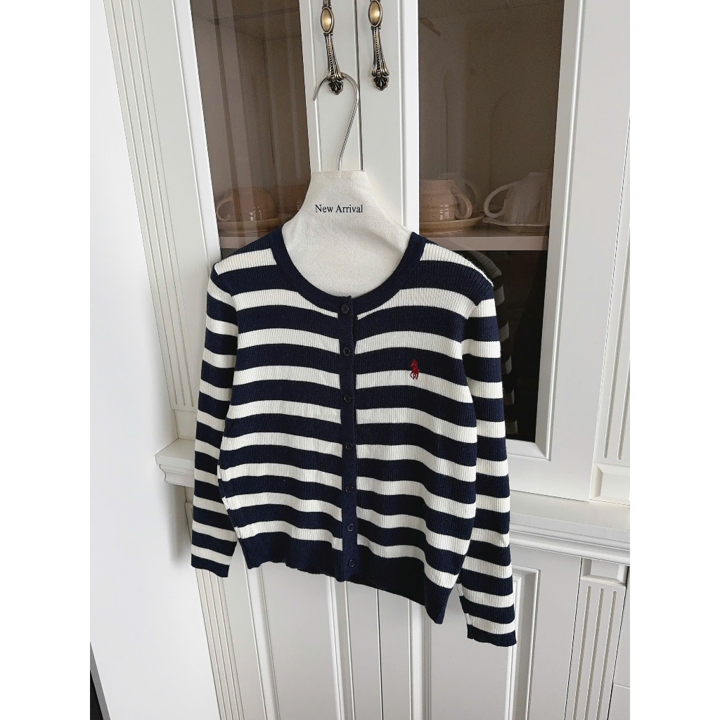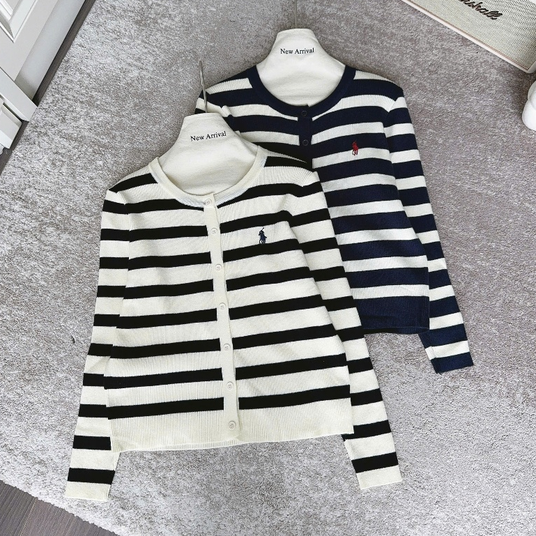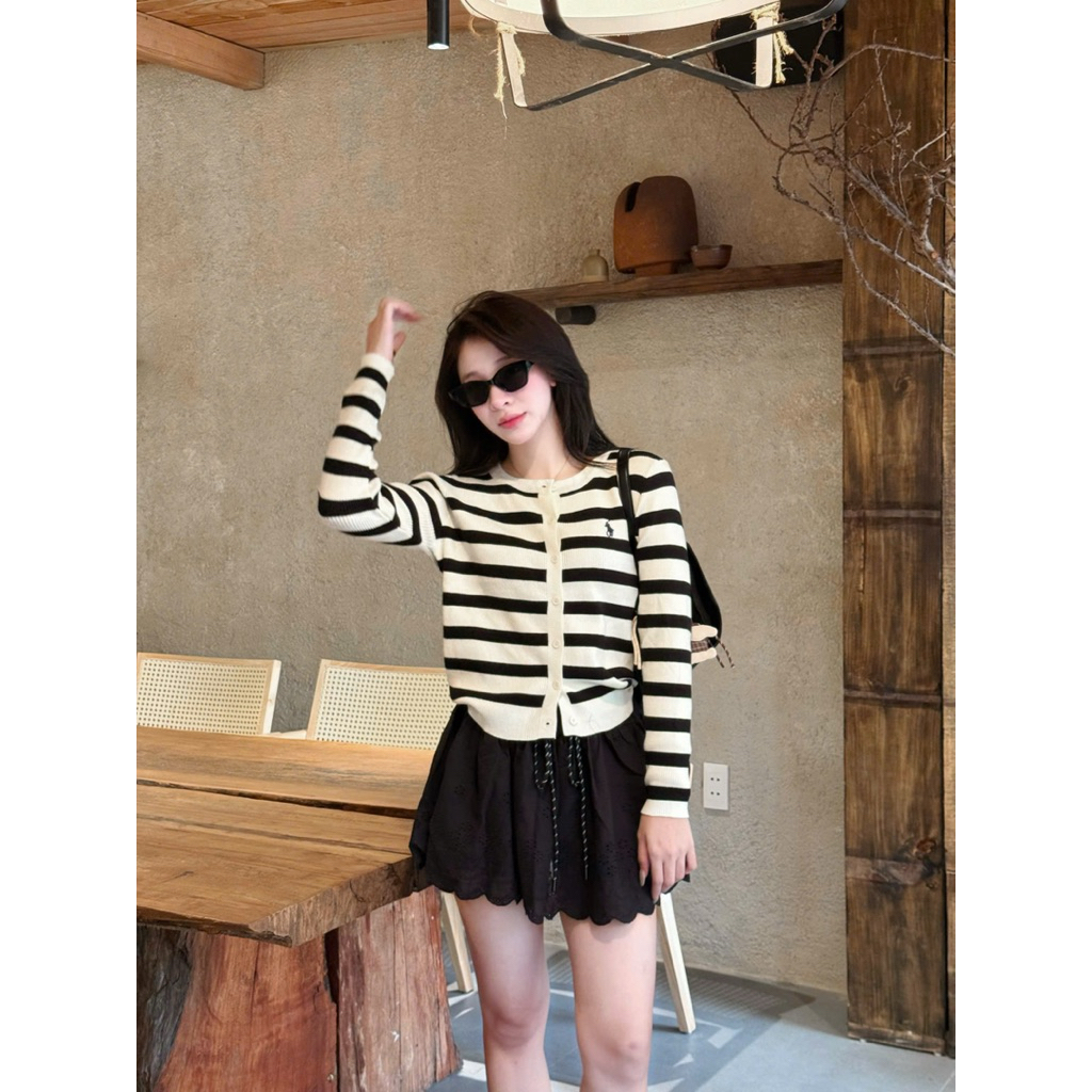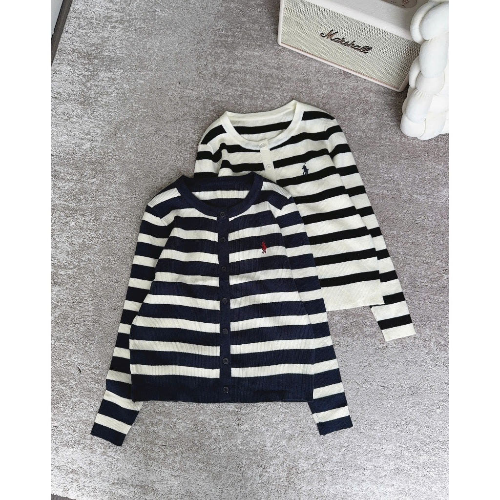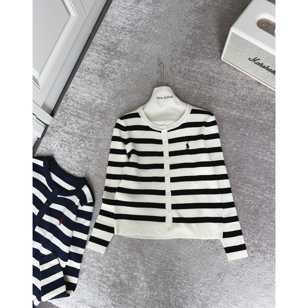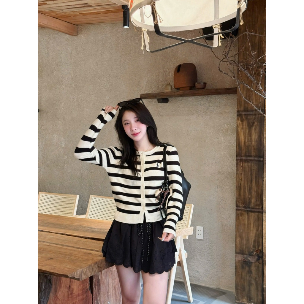 (ẢNH OLDSCHOOL) Áo len cardigan tay dài nữ cúc mở kẻ ngang chất mềm thêu logo A5208