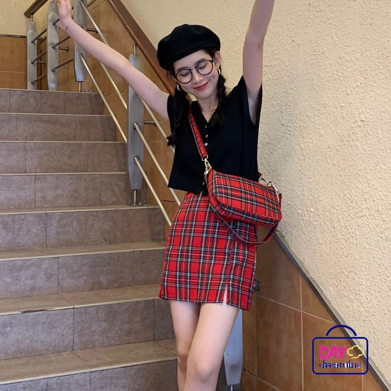 Túi canvas đeo vai họa tiết sọc caro phong cách Hàn Quốc vintage