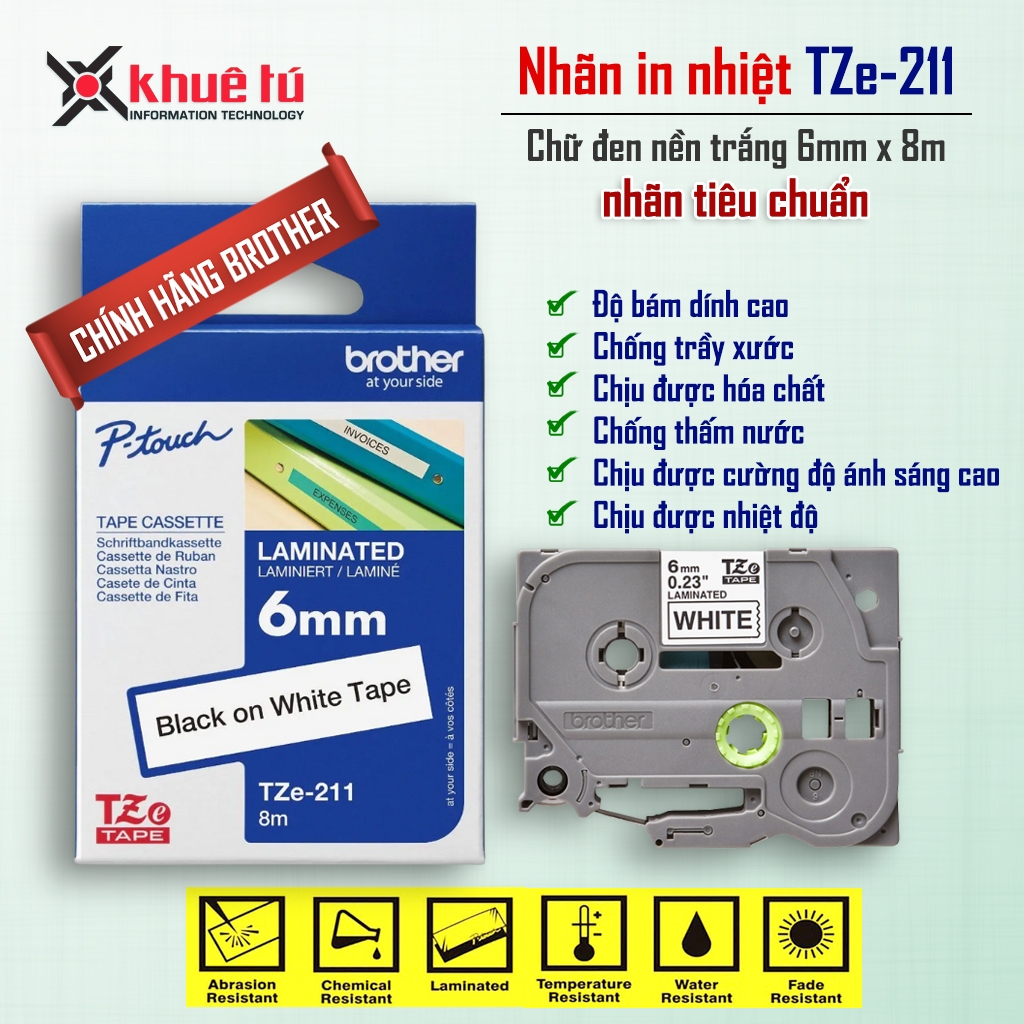 Nhãn in Brother TZe 211 (6mm x 8m - Chữ đen nền trắng)