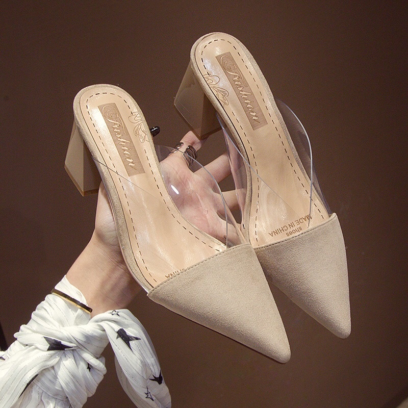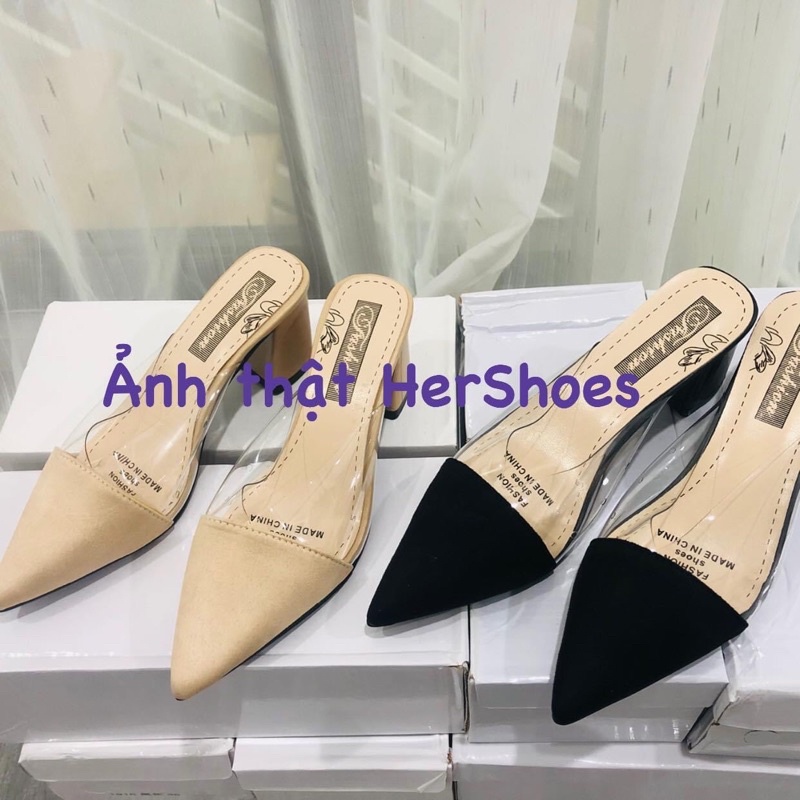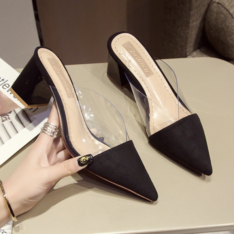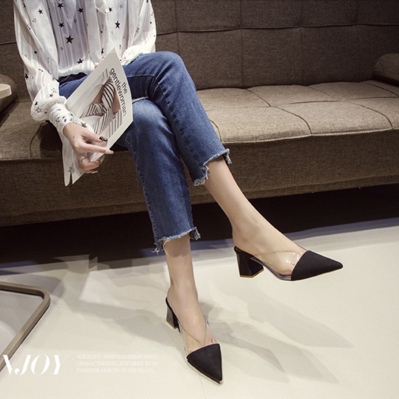 Giày sục cao gót quai trong mũi nhọn đế vuông 7 phân đủ size 34-42 - Guốc nữ quai trong suốt thời trang