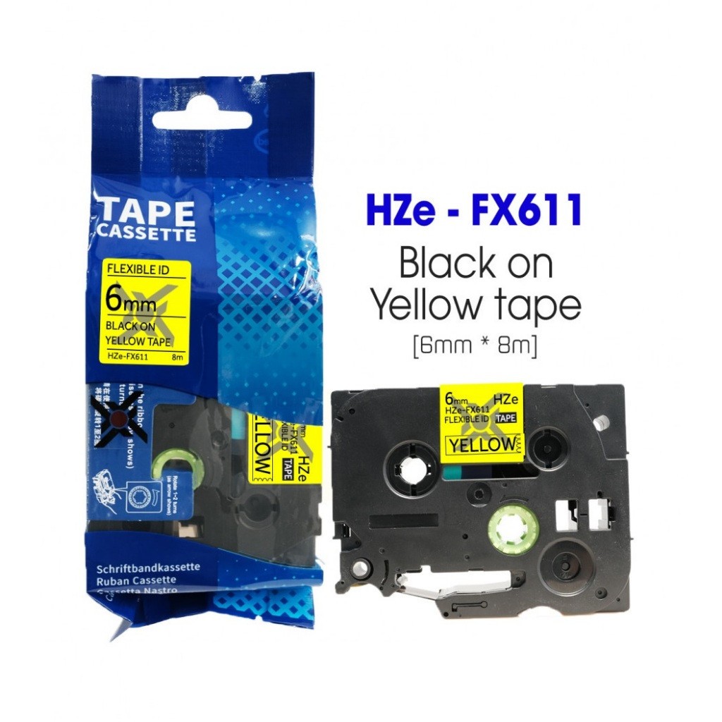 Tem Nhãn In Siêu Dẻo HZe (6mm, 9mm, 12mm, 18mm, 24mm, 36mm) dùng cho máy in nhãn Brother và Aimo (Chữ đen trên nền vàng)