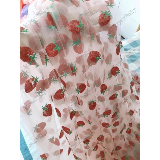 Vải lưới dâu tây làm scrunchies, may váy đầm,áo xiêu đẹp hàng loại 1