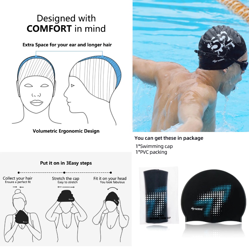 WAVE Mũ Bơi Silicone Chống Thấm Nước Dày Dặn Co Giãn Tốt Cho Nam Và Nữ