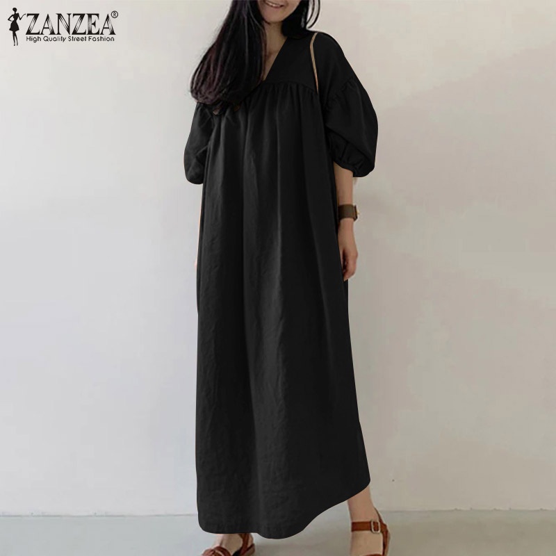 Đầm ZANZEA tay phồng cổ chữ V thời trang thanh lịch dành cho nữ