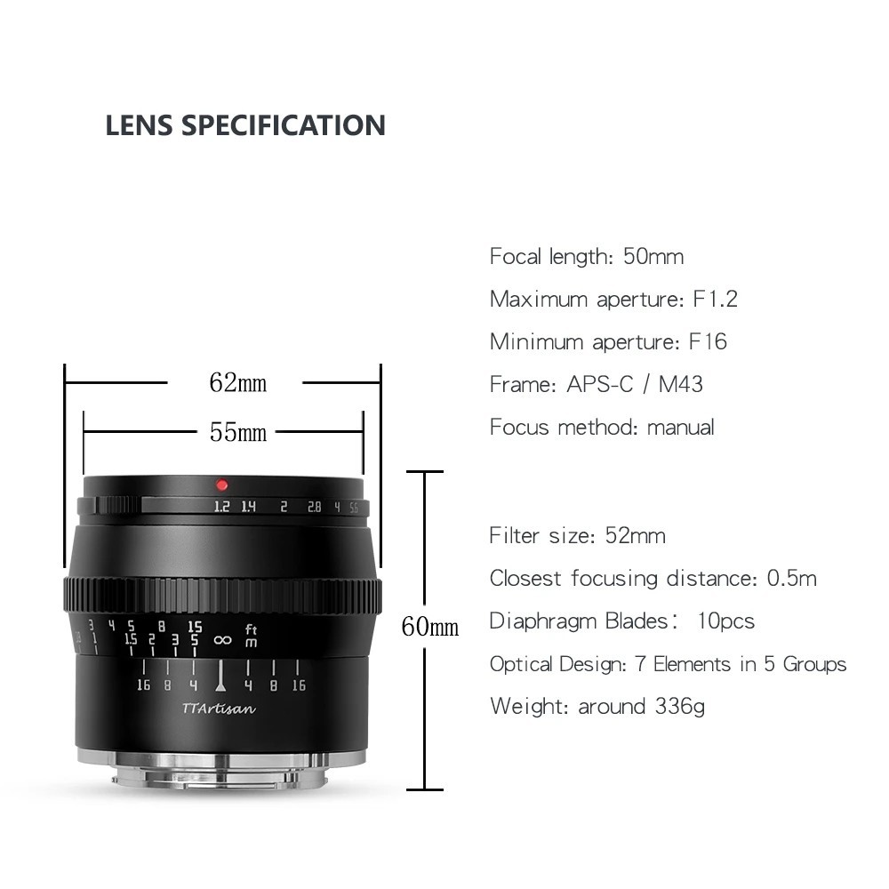Ttartisan 50mm F1.2 APS-C Khẩu độ lớn Hướng dẫn sử dụng Ống kính máy ảnh lấy nét cố định cho Sony E Fuji X Canon EOS M Panasonic Olympus M43 Đen