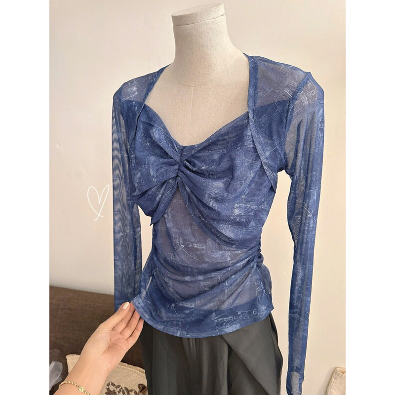 Set áo lưới loang xanh tay dài kèm quần ống rộng phong cách năng động, thoải mái ( có sẵn )