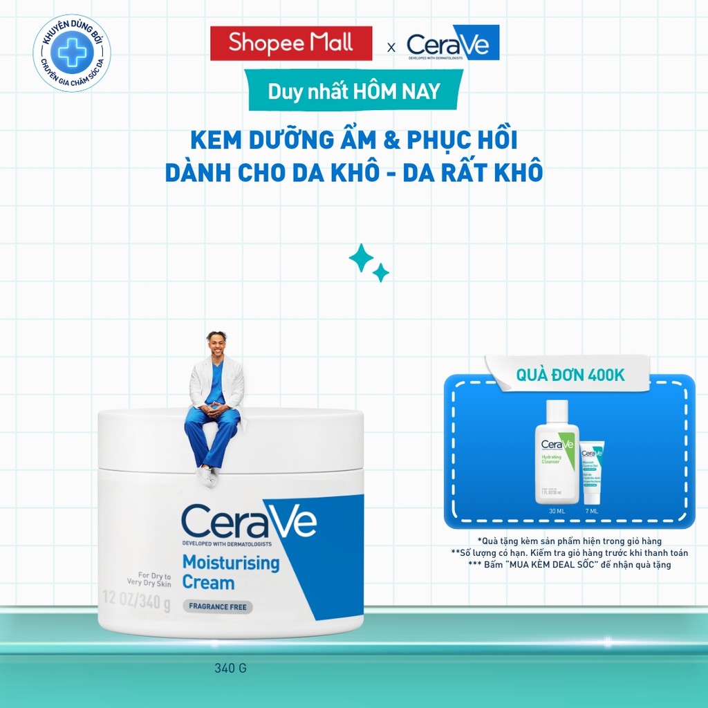 Kem dưỡng ẩm phục hồi sâu và ẩm mịn suốt 48H dành cho da khô, duy trì hàng rào bảo vệ da CERAVE MOISTURISING CREAM 340G